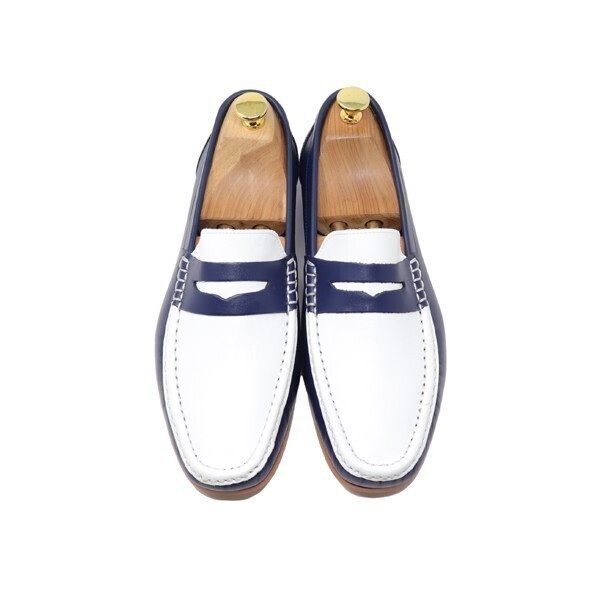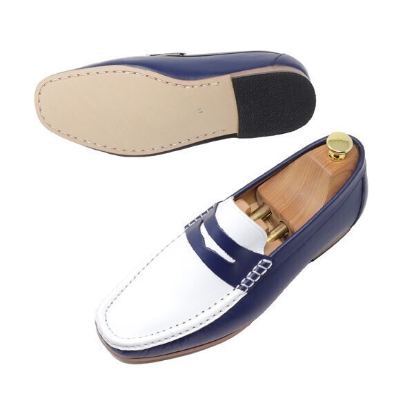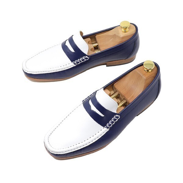 27.5cm メンズ 本革 スムース ローファー ハンドメイド スリッポン マッケイ製法 ビジネス カジュアル ホワイト&ネイビー コンビ 靴 829