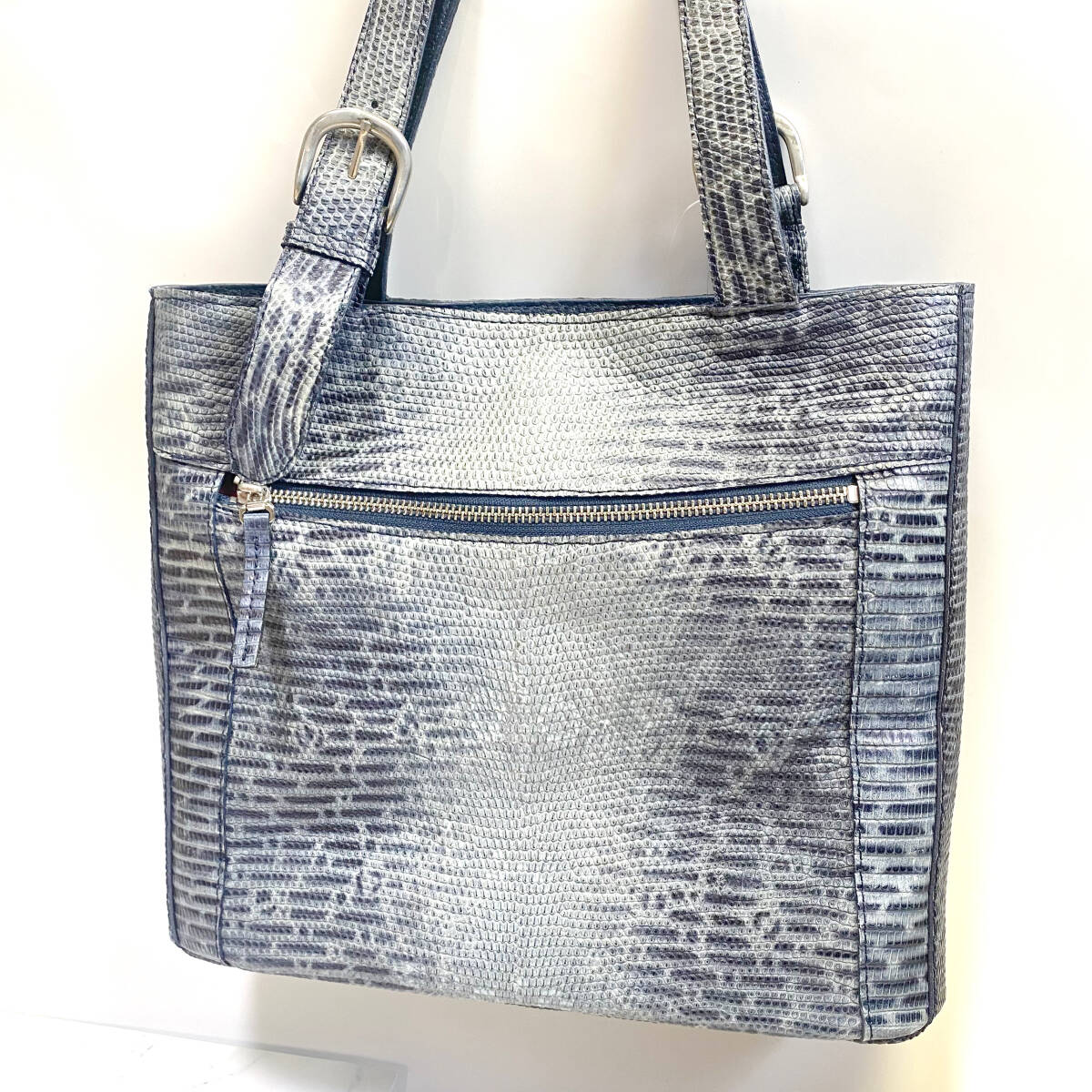 リザード本革(オオトカゲ)のトートバッグです。本革ならではの高級感でコーディネートに華やかさをプラスします。大容量の収納力でA4サイズの書類や500mlのペットボトルも楽々入ります。また、ハンドル部分はベルトで長さ調整可能なので、トートバッグとしてもハンドバッグとしてご利用頂けます。