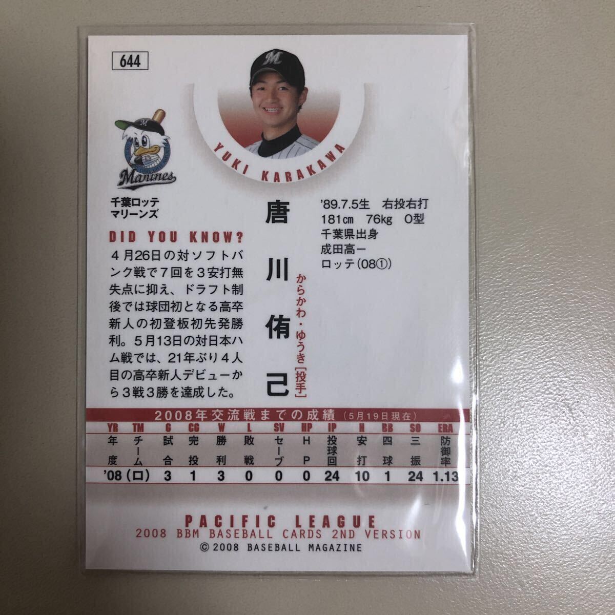 BBM 2008 2nd 644 唐川侑己 千葉ロッテマリーンズ レギュラーカード
