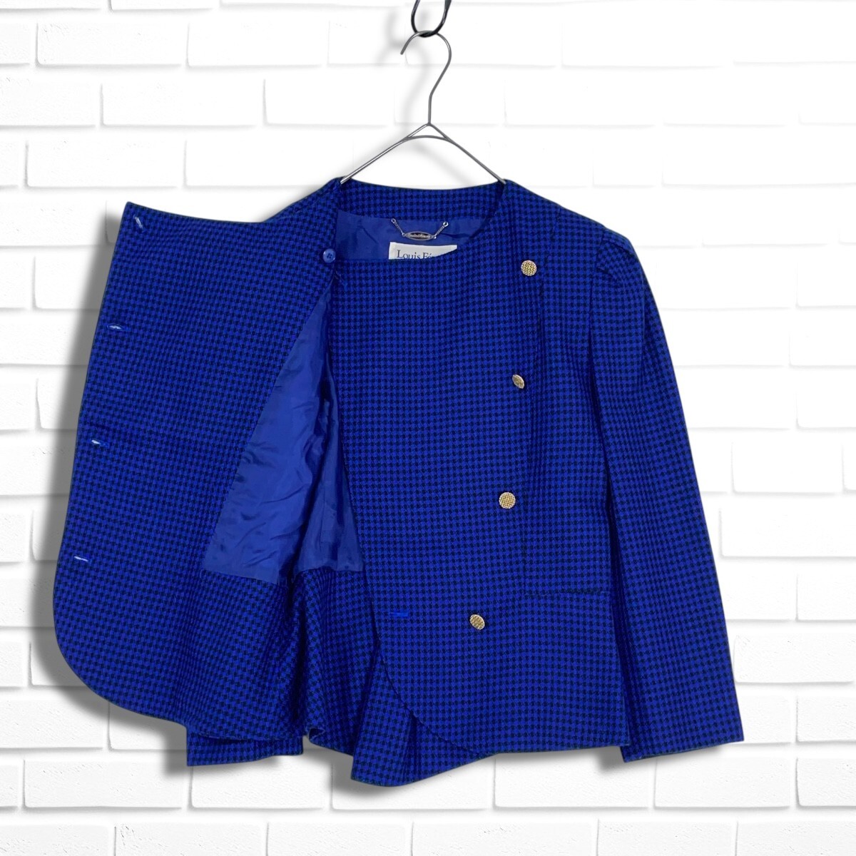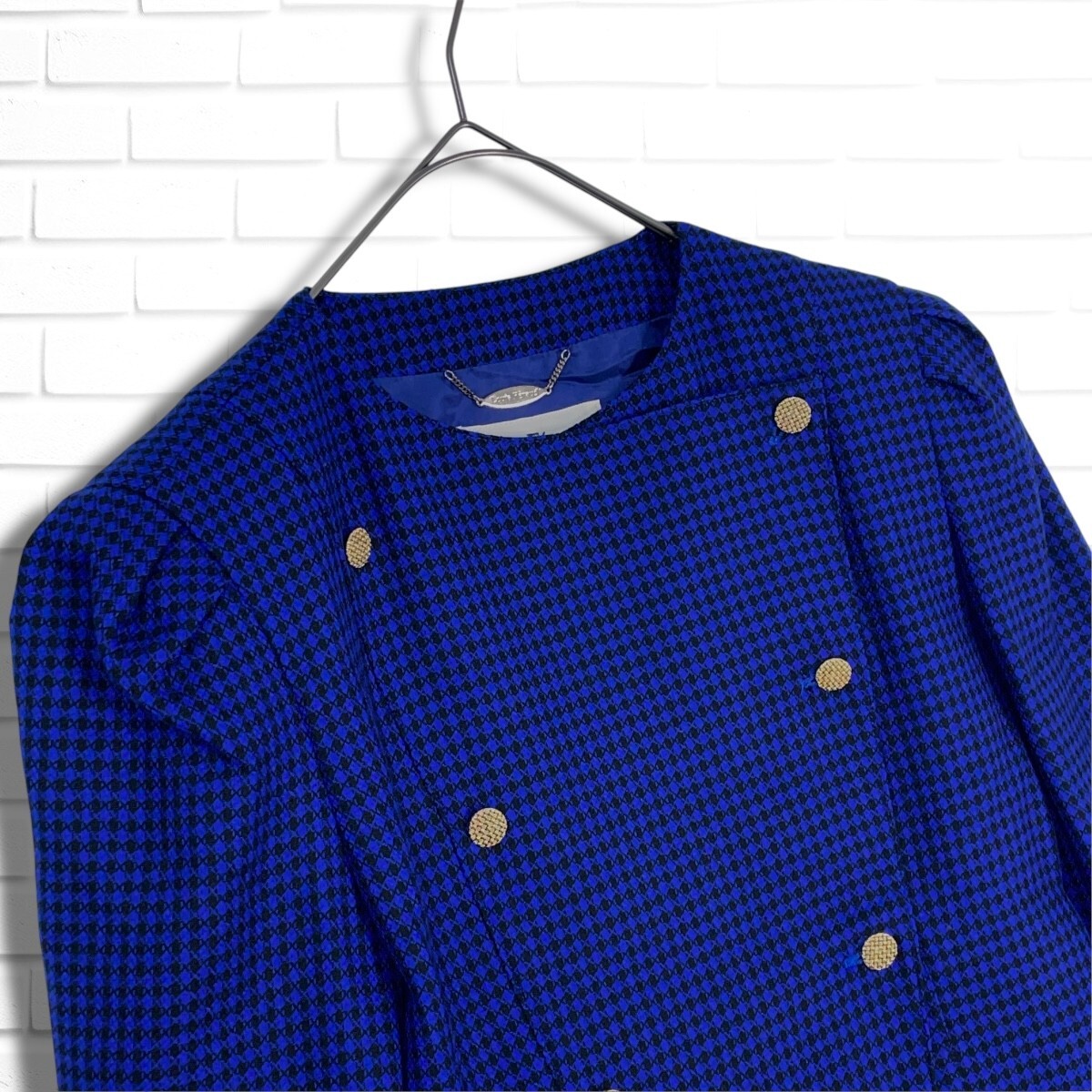 ◆美品◆  Louis Feraud ルイフェロー ウール 総柄 金ボタン レトロ ノーカラー ジャケット 黒 青 ブラック ブルー レディース ◆送料無料◆ 3965D◇