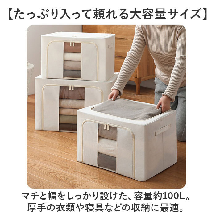 | 商品説明 | ・・【かさばりがちなアイテムの収納に】 ・すっきり整理整頓できて、すぐに取り出せる♪大容量の「折りたたみ式収納ボックス 」。 ・【たっぷり入って頼れる大容量サイズ】 ・マチと幅をしっかり設けた、容量約100L。厚手の衣類や寝具などの収納に最適。 ・【あれ?どこ行った?悩みを解消】 ・フタを開けなくても中身が確認できる、クリア窓付き。フロントと片サイドから中身を確認。 ・【大きく開いて便利な2面開口】 ・・2つの開口部を配置。ぐるっと開くダブルファスナー式で出し入れも手間取らない! ・【へたりにくくスタッキングも安心】 ・内側には折りたたみ式のフレーム。3辺を固定できて型崩れしにくく、積み重ねOK。 ・【持ち運びもスムーズな持ち手付き】 ・両サイドには、サッと持ち上げ可能な持ち手付き。本体は軽量なので、移動もラクラク。 ・【丈夫で衣類等にも優しい仕上がり】 ・本体は耐久性と耐摩耗性を持つ、綿麻混紡素材。通気性にも優れ、衛生的に保管。 ・【内側撥水でお手入れもカンタン】 ・内側に汚れなどを弾く撥水性を。お手入れも拭き取るだけで、ストレスフリー。 ・【使い方いろいろ◎マルチに活躍】 ・お子さまが遊ばなくなったおもちゃ、日用品などの収納にも。使い方は自分次第。 ・【押入れやクローゼットの片付けに】 ・衣類などをまとめたら、そのままクローゼットへ。衣替えもあっという間に完了。 ・【使わない時はスリムにまとまる】 ・嬉しい折りたたみ式ボックス。使わない時も収納場所に困らない! |