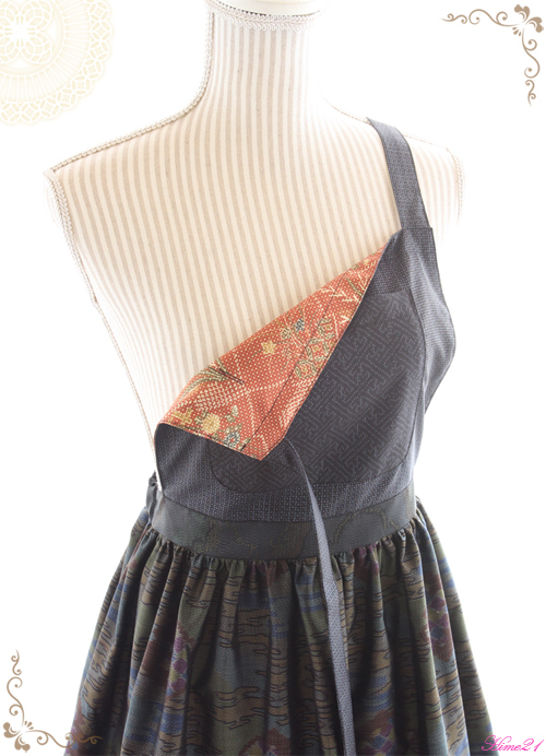 胸当て裏は、オレンジ系の後染め大島を使用。