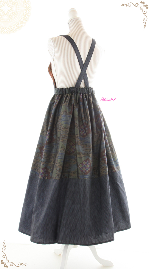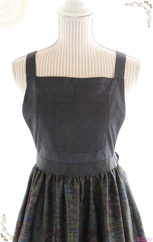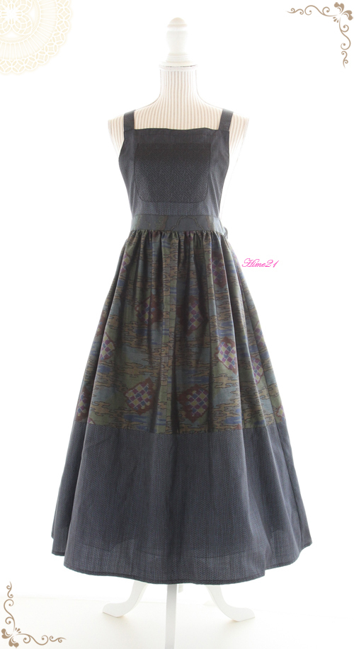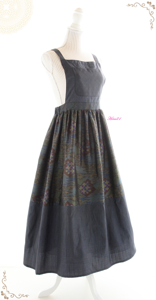 【大島紬数種仕立て】エプロンドレス☆ロング丈(紺色ネイビー系)/ジャンパースカート サロペット 着物リメイク・シルク絹  tsu840