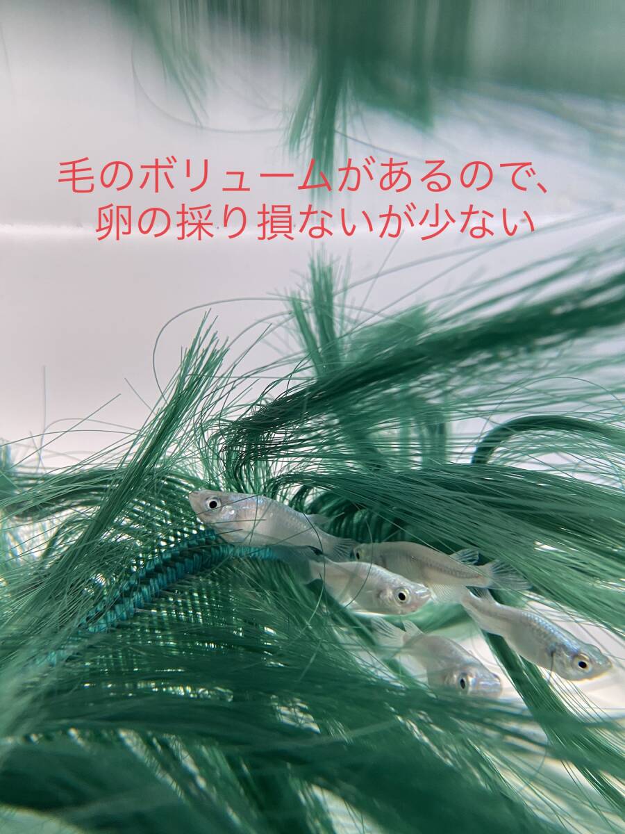 らんちゅう、オランダや東錦、和金、琉金等の金、錦鯉の産卵、またポリプテルスの産卵や、小型シュリンプの稚エビやグッピー、プラティなどの卵胎生メダカの稚魚の隠れ家や餌場としても適していますが、特にめだかの産卵に適するよう短めの長さにカットしています。