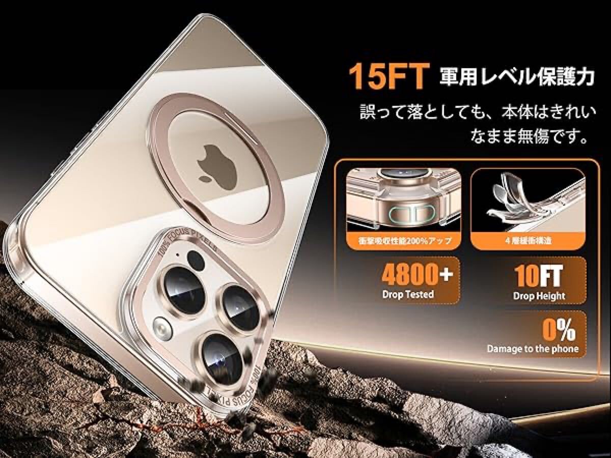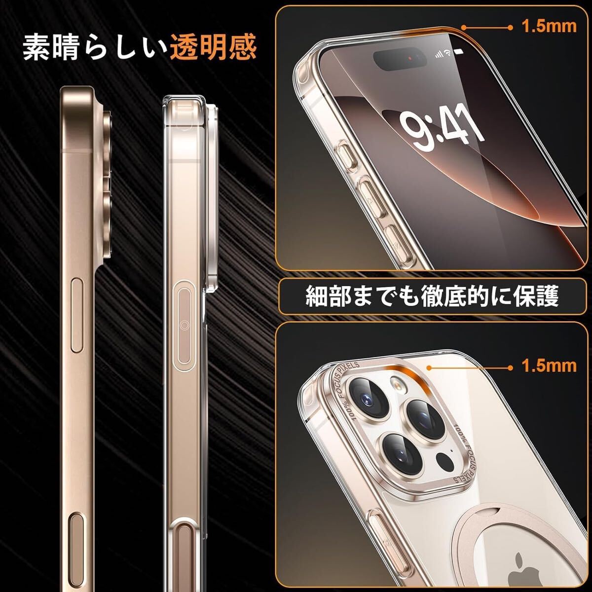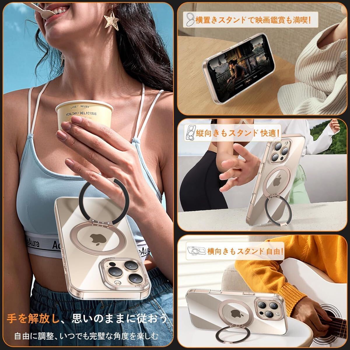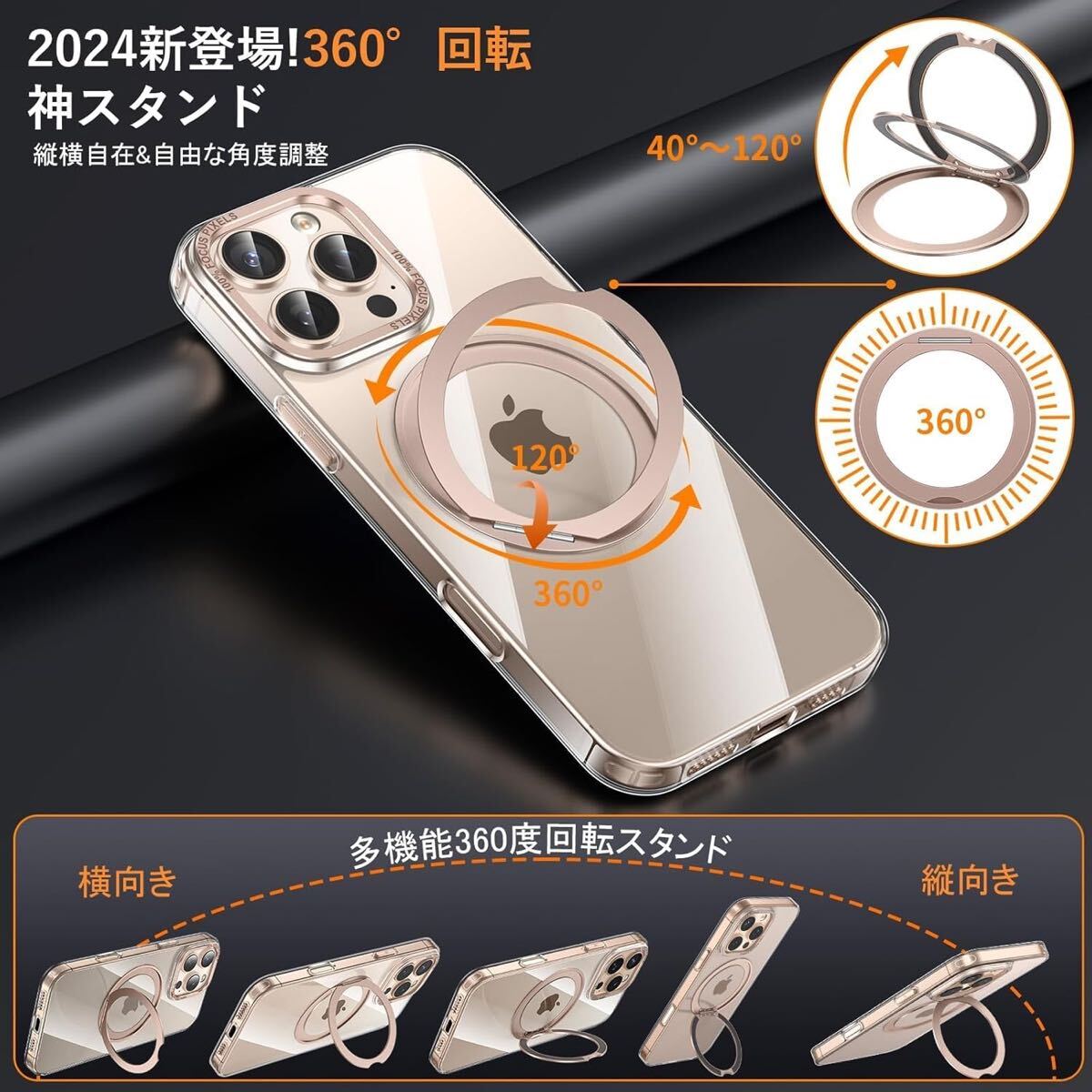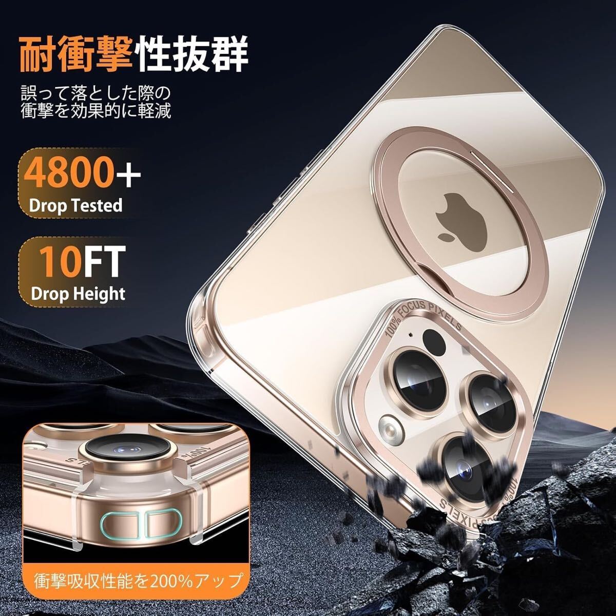 iPhone 16 Pro Max 用 ケース Magsafe対応 ワイヤレス充電 360°回転スタンド 縦横両対応 スマホケース 米軍規格 耐衝撃 半透明 マット感 マグセーフ 防指紋 リング マグネット搭載 アイフォン16プロマックス 用 カバー「クリア・ゴールド」
