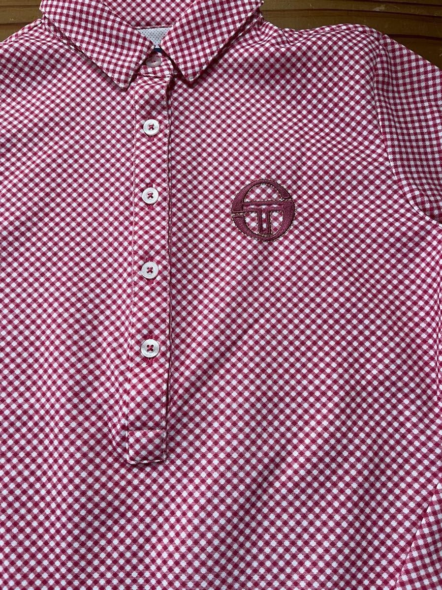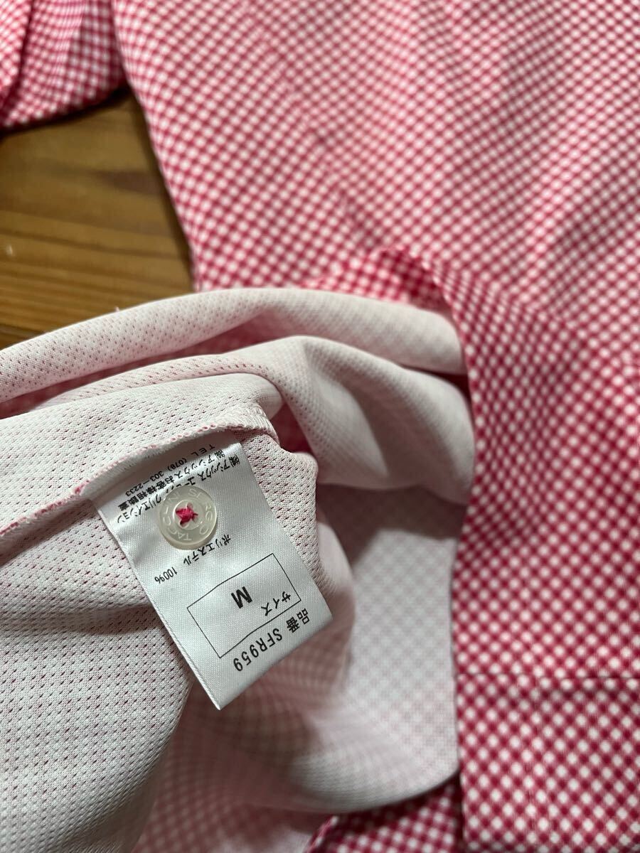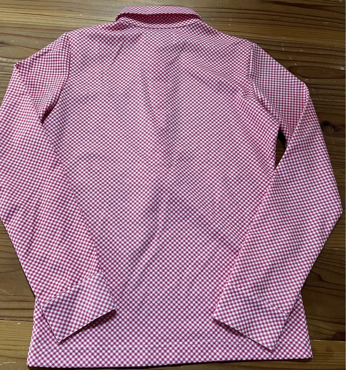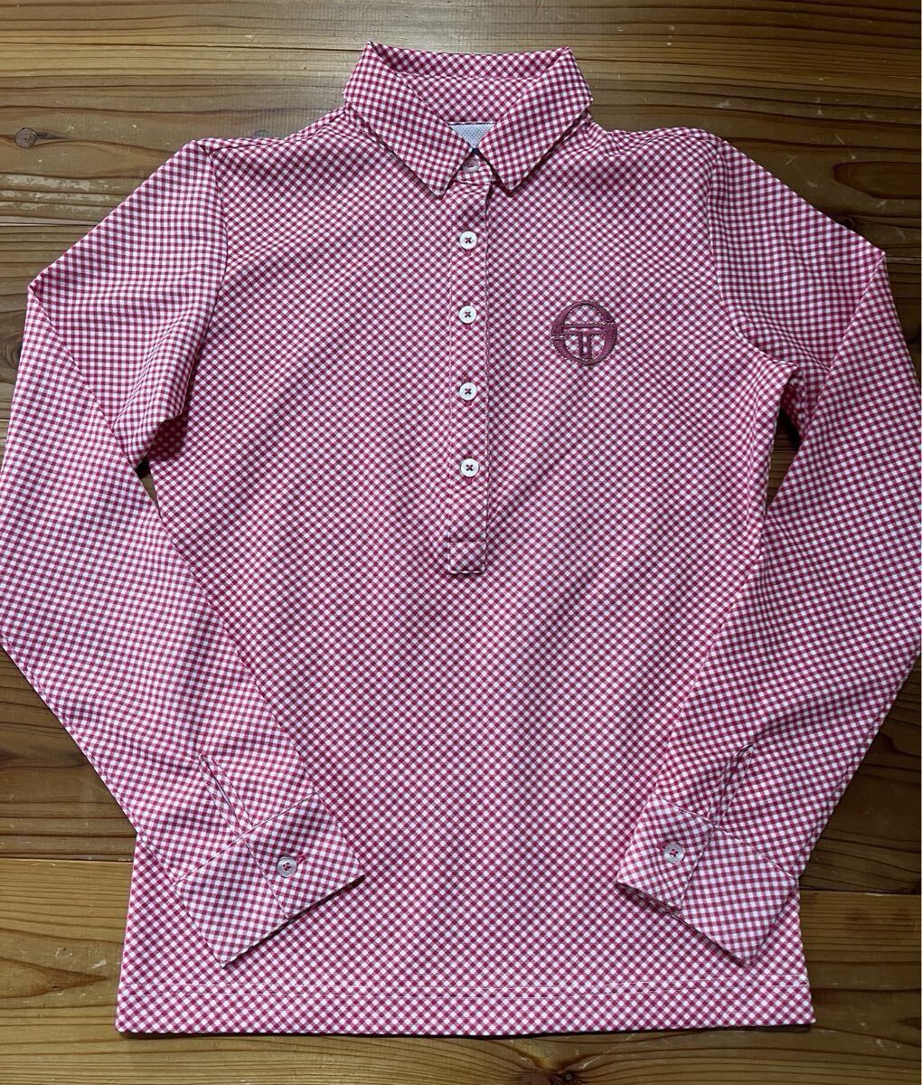 ピンクと白のギンガムチェックで、胸のマークにラメの糸が入っていて高級感があります。