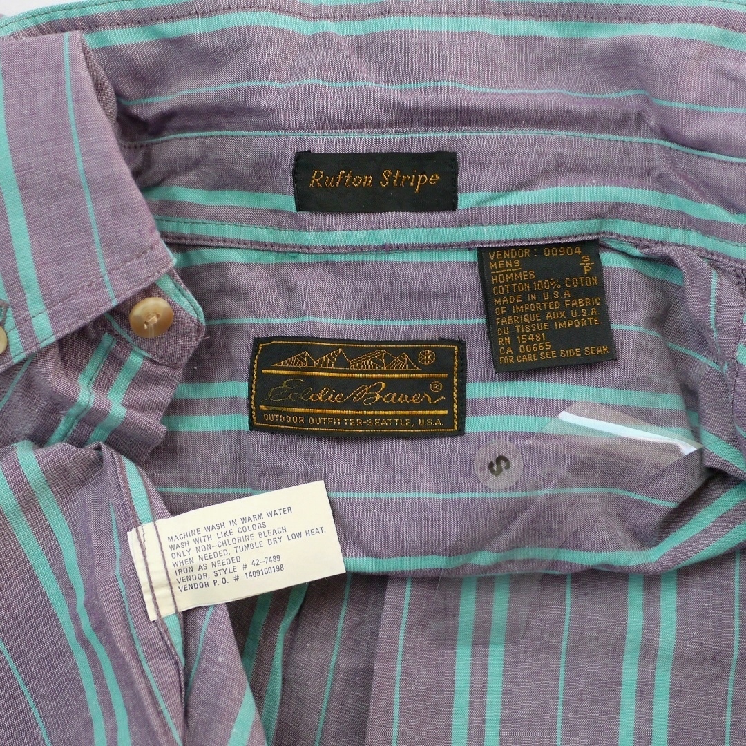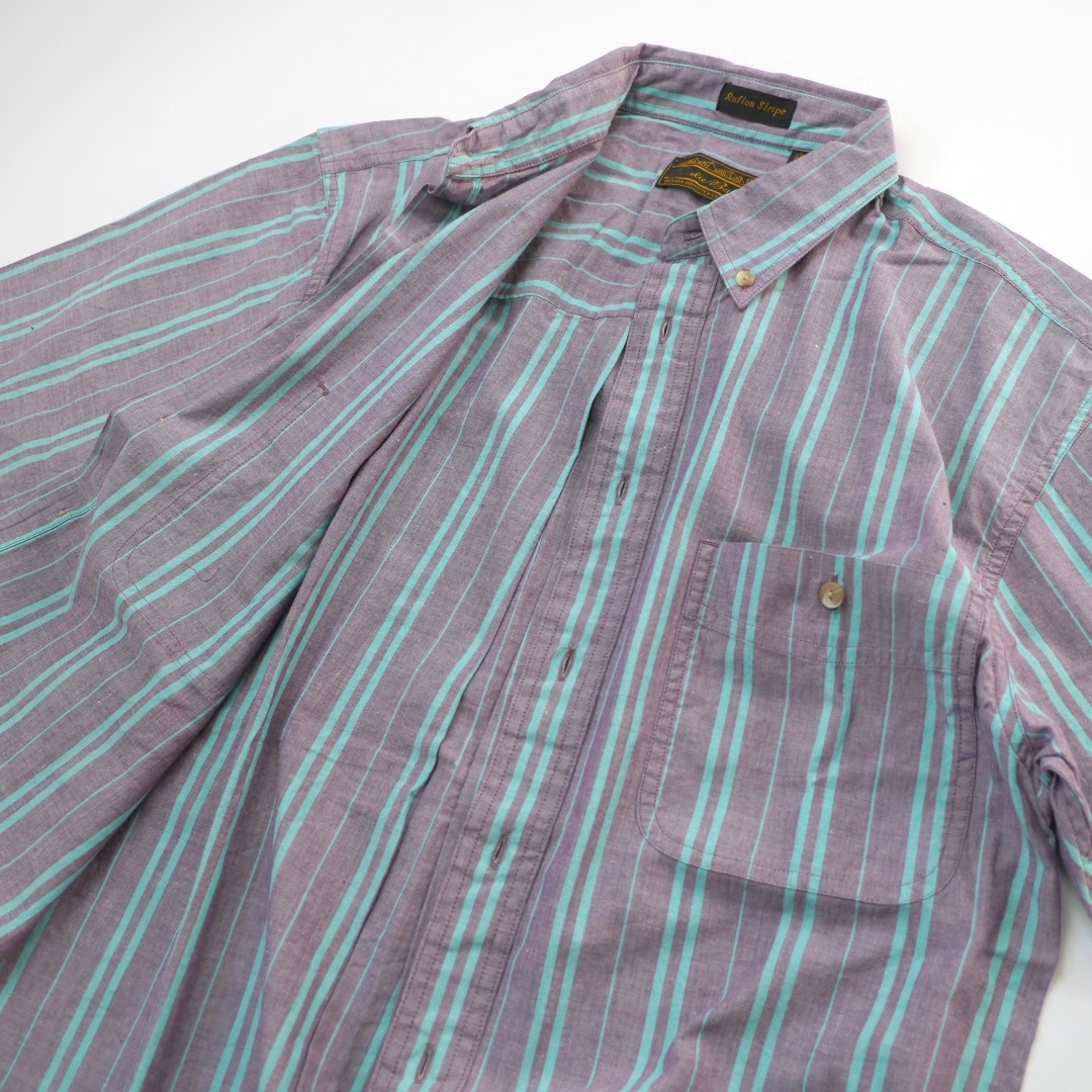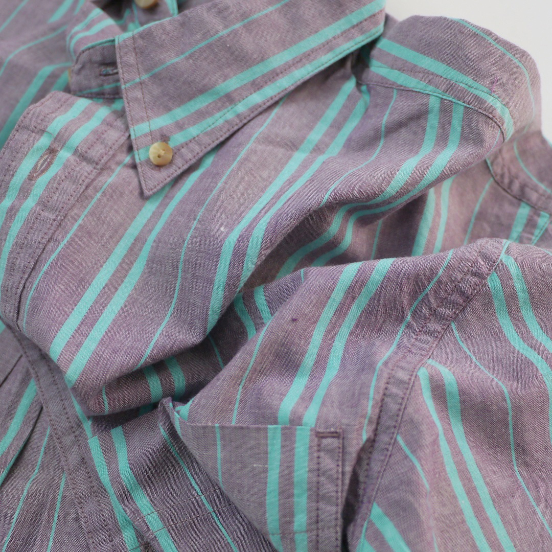 ■ブランド 80s-90s、Eddie Bauer、Rufton Stripe、MADE IN USA ■カラー 薄紫色×薄水色(パープル×エメラルドグリーン系) ■素材 100% COTTON ■詳細 アメリカで購入したエディーバウアーのストライプボタンダウンシャツです。 80年代-90年代ごろの黒タグでアメリカ製になります。 モデル名はラフトンストライプ、ラフトンツイルとは異なる薄めのオールコットン生地です。 ネオンストライプのような独特のカラーリングで最高に雰囲気があります。 マルチストライプ/ダブルストライプのデザインもイイ感じにお洒落です。 ■状態 デッドストックです。 生地のシームなどにシワ感が多少ありますのでプレウォッシュモデルかもしれません。 経年保管による多少のシワ、所々に製織時に生じたネップあとあり。 着用に問題あるダメージはなく良好です。 ■サイズ 表記 S *実寸参考下さい 身幅や首周りはSM相当ですがビッグシルエット?で肩幅袖丈着丈は作りが大きめです。 身幅はセンターボックスプリーツ入りで若干広がります。*実寸参考下さい 着丈前 78cm 着丈後 80cm 肩幅 49cm 身幅 50cm-52cm 腰幅 51cm 裄丈 51cm 脇袖丈 15cm 肩袖丈 26cm ■注意事項 状態は細かく確認しておりますが、傷や汚れの見落とし、実寸誤差、色味差異など生じる場合がございます。 不明な点がありましたら入札前にご質問下さい。 商品にあわせて洗濯やクリーニングメンテナンスを施しておりますが、ビンテージやアンティークなど中古品になりますので特性のご理解をお願いします。 |