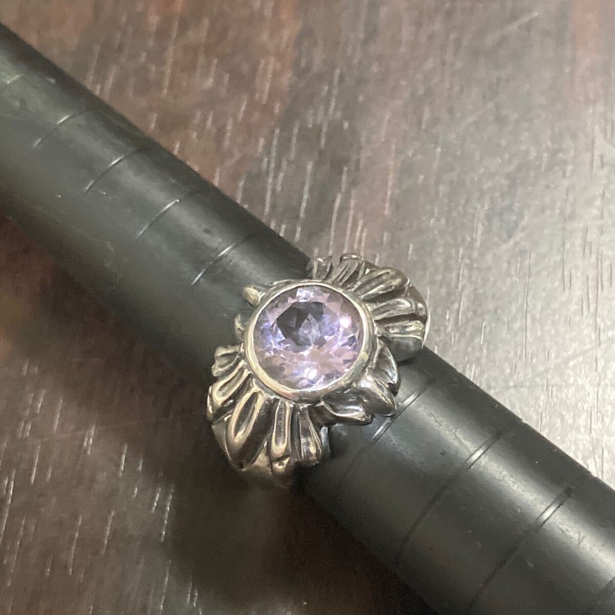 花や蜘蛛にも見えるデザインに照りの良い10mmもある大粒のライトカラーのアメジストをあしらった中々無いオリジナルリングです。