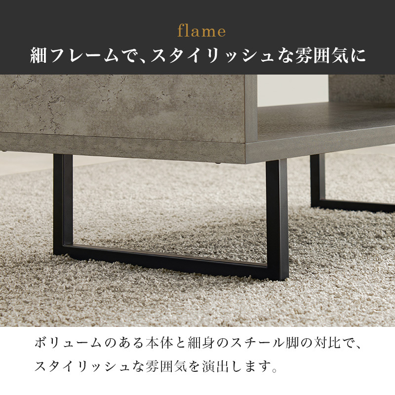 存在感のあるコンクリート柄の天板にスチール脚を合わせたデザイン。