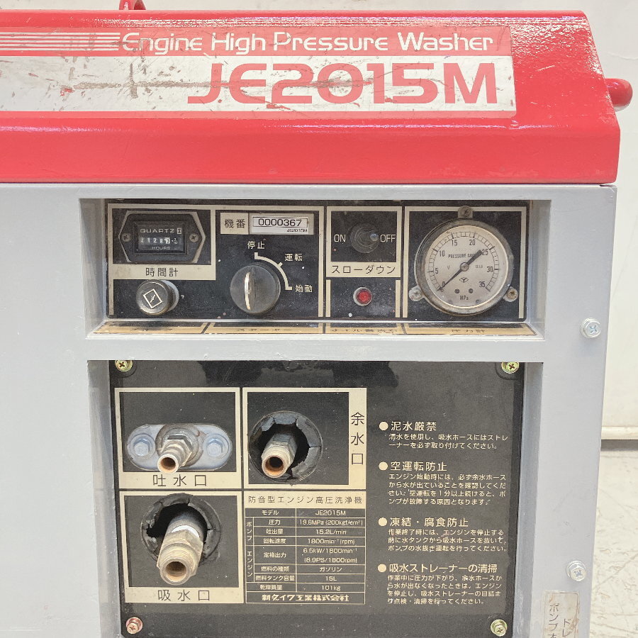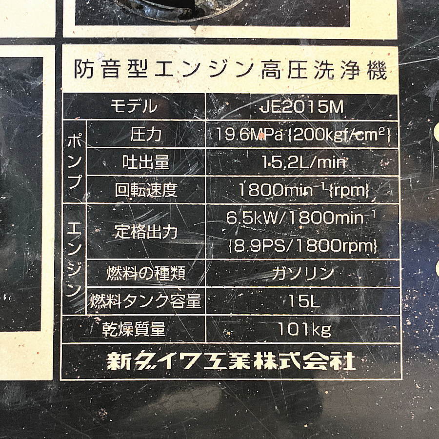| 管理番号:1100000098016 メーカー:新ダイワ 型番:JE2015M 規格・仕様: *ポンプ ・圧力:19.6MPa(200)(kgf/cm2) ・吐出量:15.2L/min ・回転速度:1800min-1{rpm} *エンジン ・定格出力:6.5kW/1800min-1(8.9PS/1800rpm) ・排気量:337ml ・使用燃料:無鉛ガソリン ・燃料タンク容量:15L ・外形寸法:819×512×618mm ・乾燥質量:101kg 詳細備考: 20MPa 15Lの高圧タイプです。 専門業者にて整備、再塗装済みです。 ガン、ホースは新品です。 運転時間:2128.7h 商品は写真に写っているもので全てです。(※背景などにある無関係の物は含まず) 他に付属品はありません。 ご質問はお気軽にどうぞ。分かる範囲でお答えします!! ※上記は型番などから調べたデータを抜粋したものです。 |