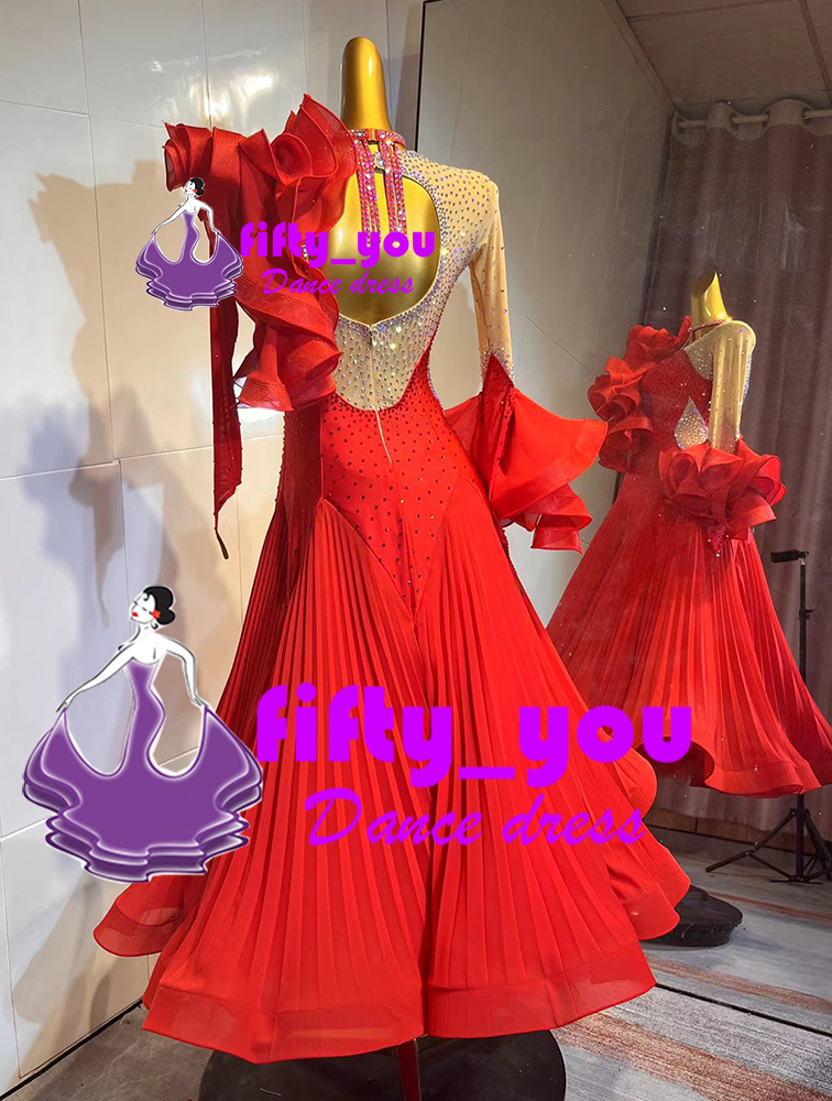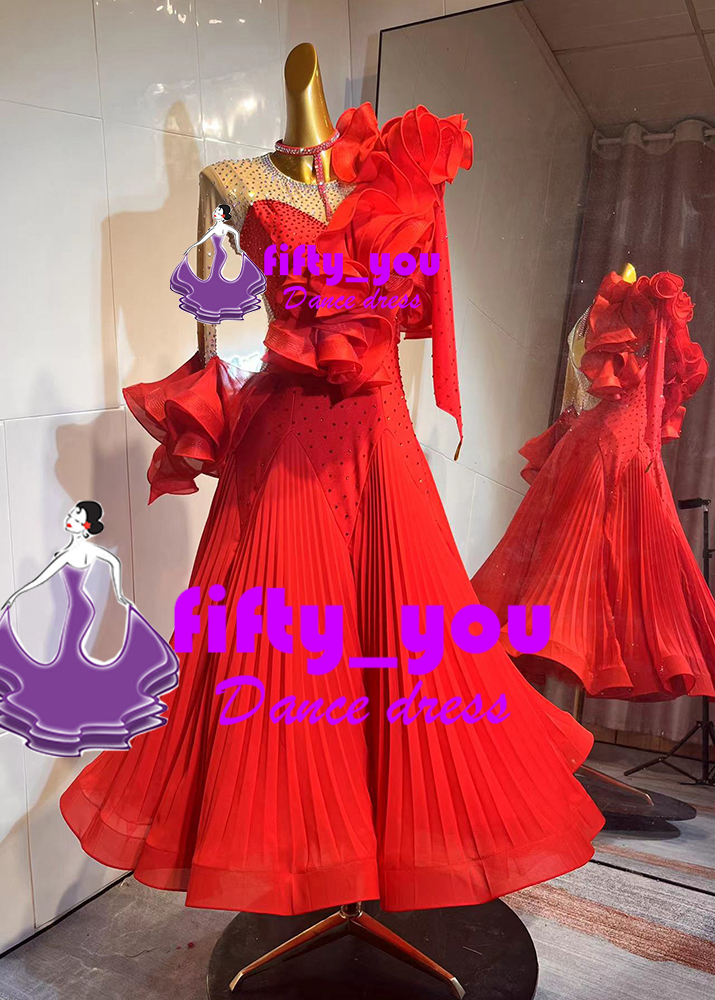 新品fifty_you レディース社交ダンスドレス  モダン競技会用ワルツドレス スタンダードドレス 高級ドレス フリル飾り 明るい赤色