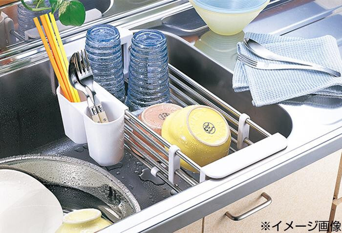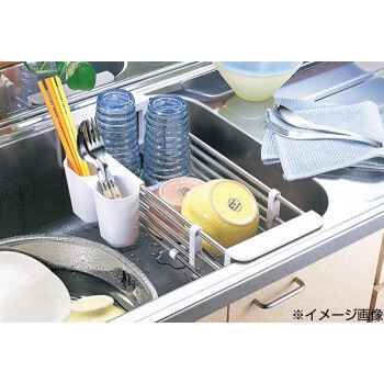 野菜や食器の水切りに重宝するボックスタイプ。洋食器や箸なども手軽に水切りできる小物ポケット付。36.5~56cmまでのシンク幅に対応。 |