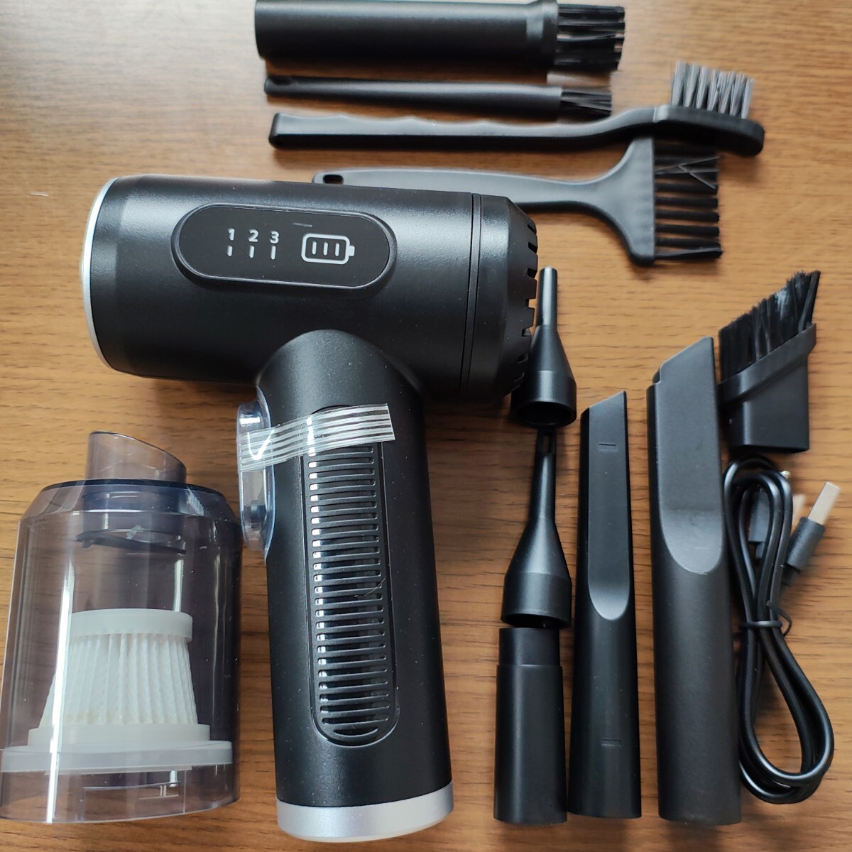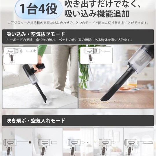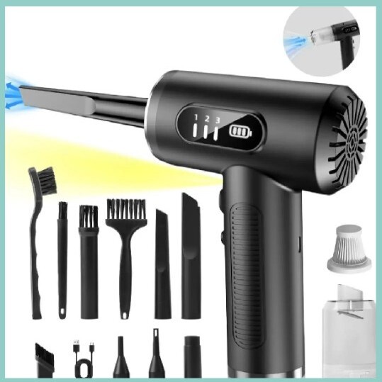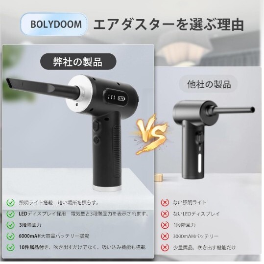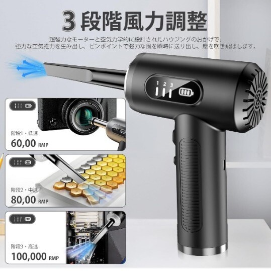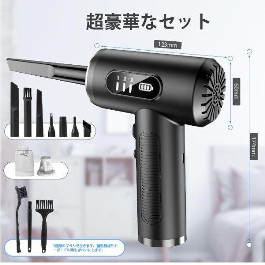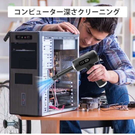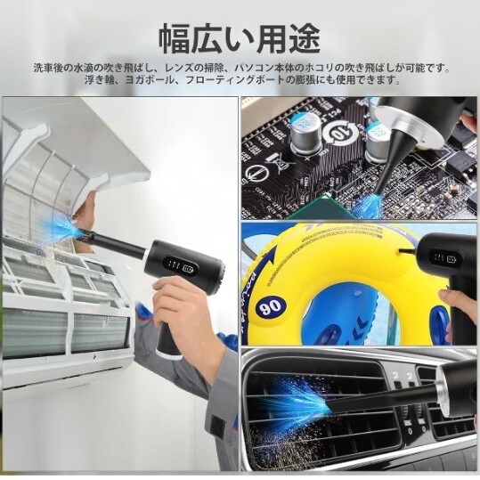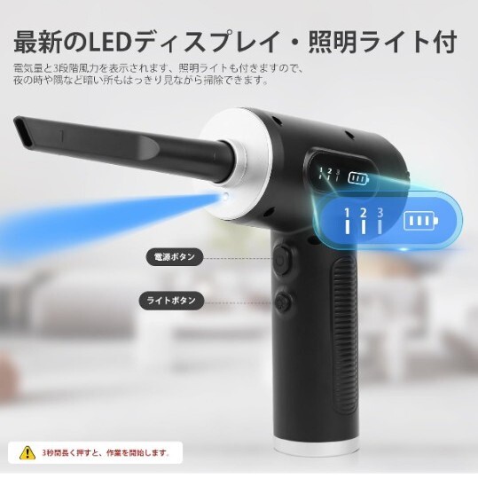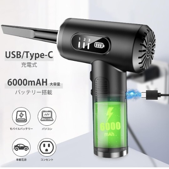 エアダスター 超強力電動エアダスター 3段階風力調整・LEDディスプレイ・ミニ掃除機1台2役 USB充電式 コードレス 6000mAhバッテリー内蔵 90000RPMブラシレスモーター搭載 LEDライト&6種類ノズル付 吹き出す&空気入れ 車内清掃・キーボード・OA機器・パソコンpc掃除に最適 Black