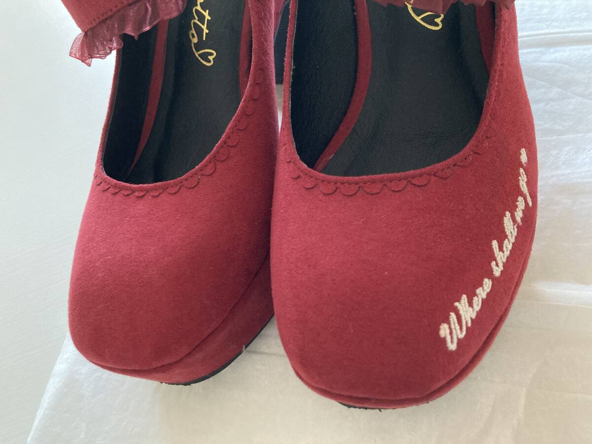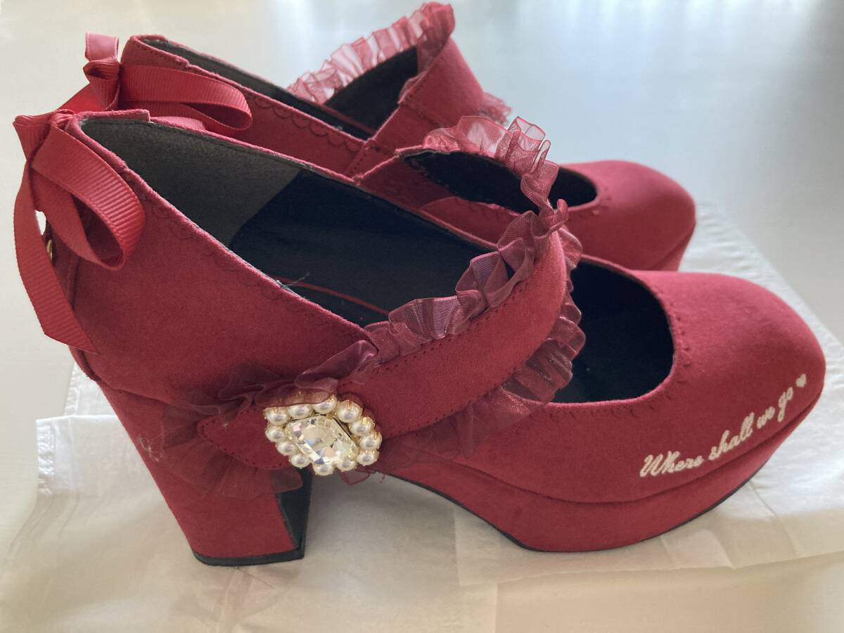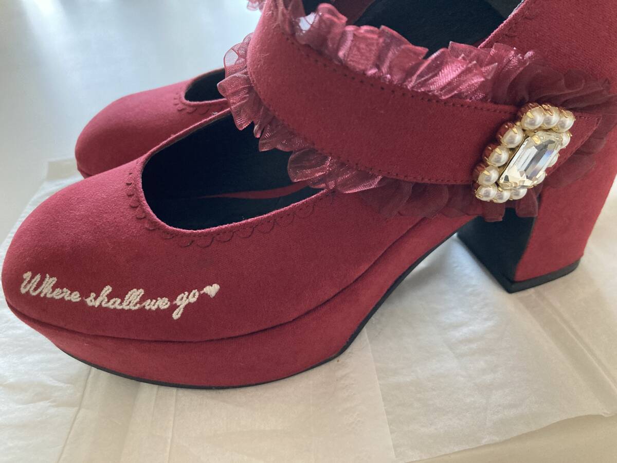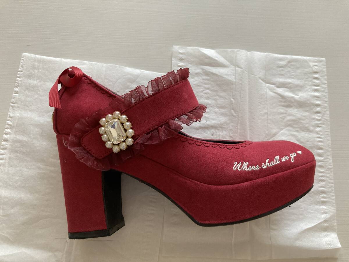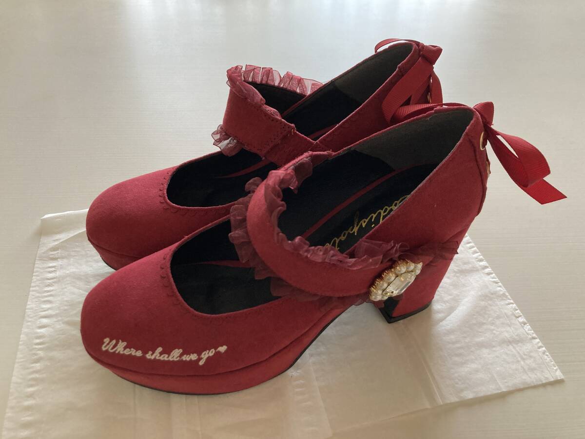 状態良好!ロディスポット パンプス★LODISPOTTO 靴 シューズ レッド 赤 ワインレッド リボン キラキラ ビジュー 編み上げ 英字 ロリータ