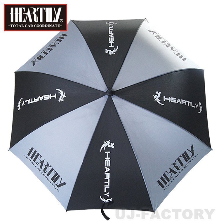 ★プッシュ式のワンタッチオープンで、グリップから先端まで約98cm、開いたときの直径130cmです。もちろん、雨傘(雨降りも)、日傘(日よけ)のどちらでも使用可能です。もちろん、「HEARTILY」と「牙ロゴ」のデザインです。