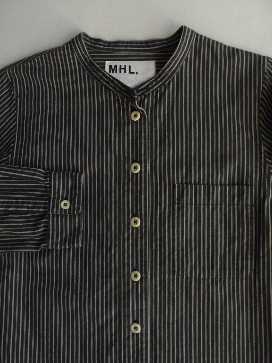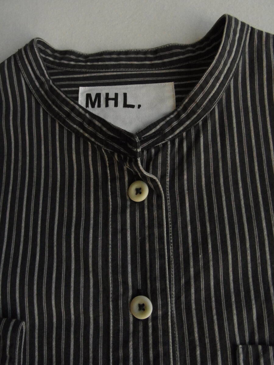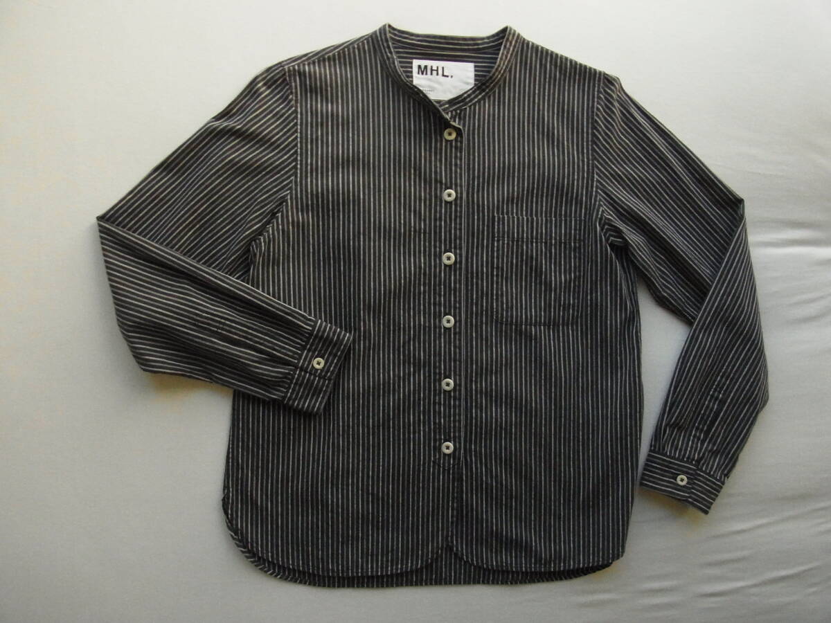 M H L.  マーガレットハウエルのストライプ柄でAラインのバンドカラーシャツになります。USEDで着用感御座いますが、特に目立ったダメージ等は御座いません。