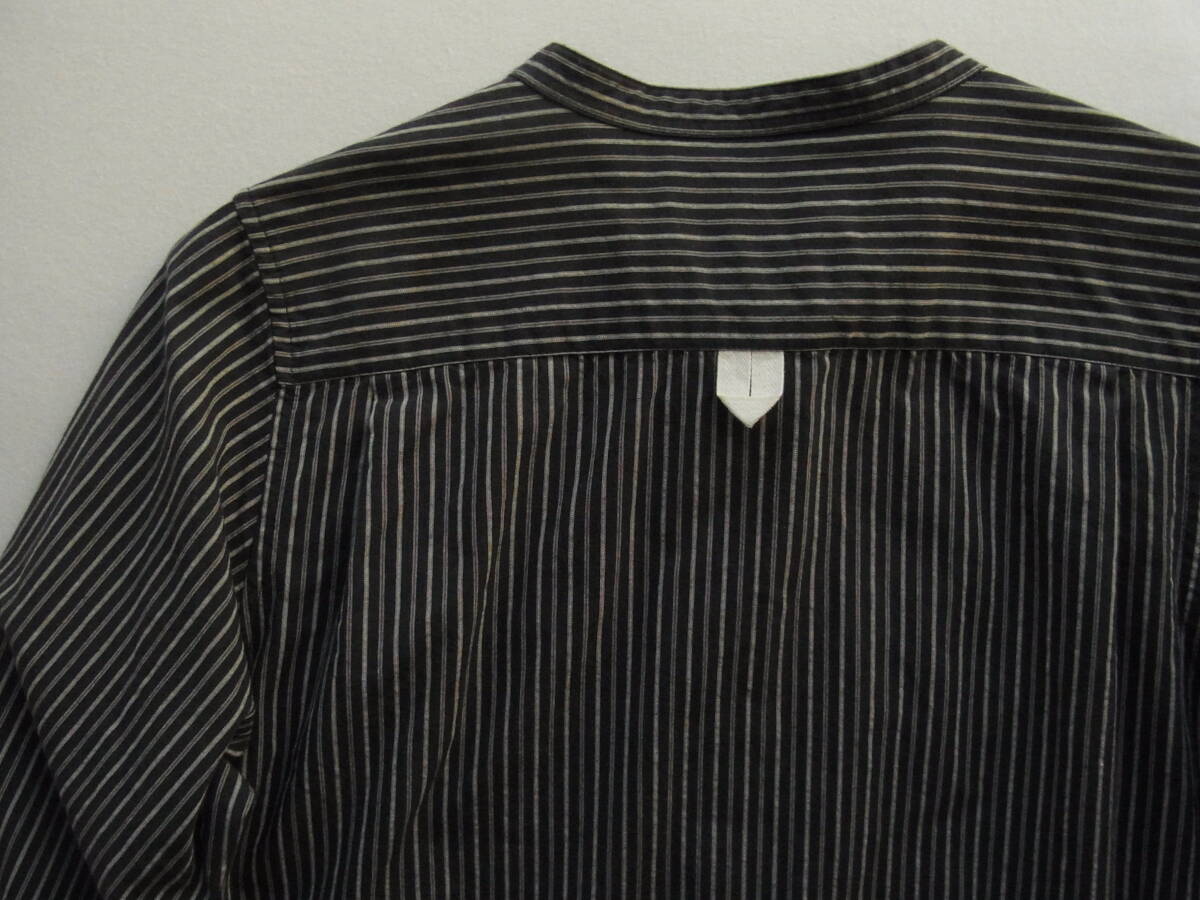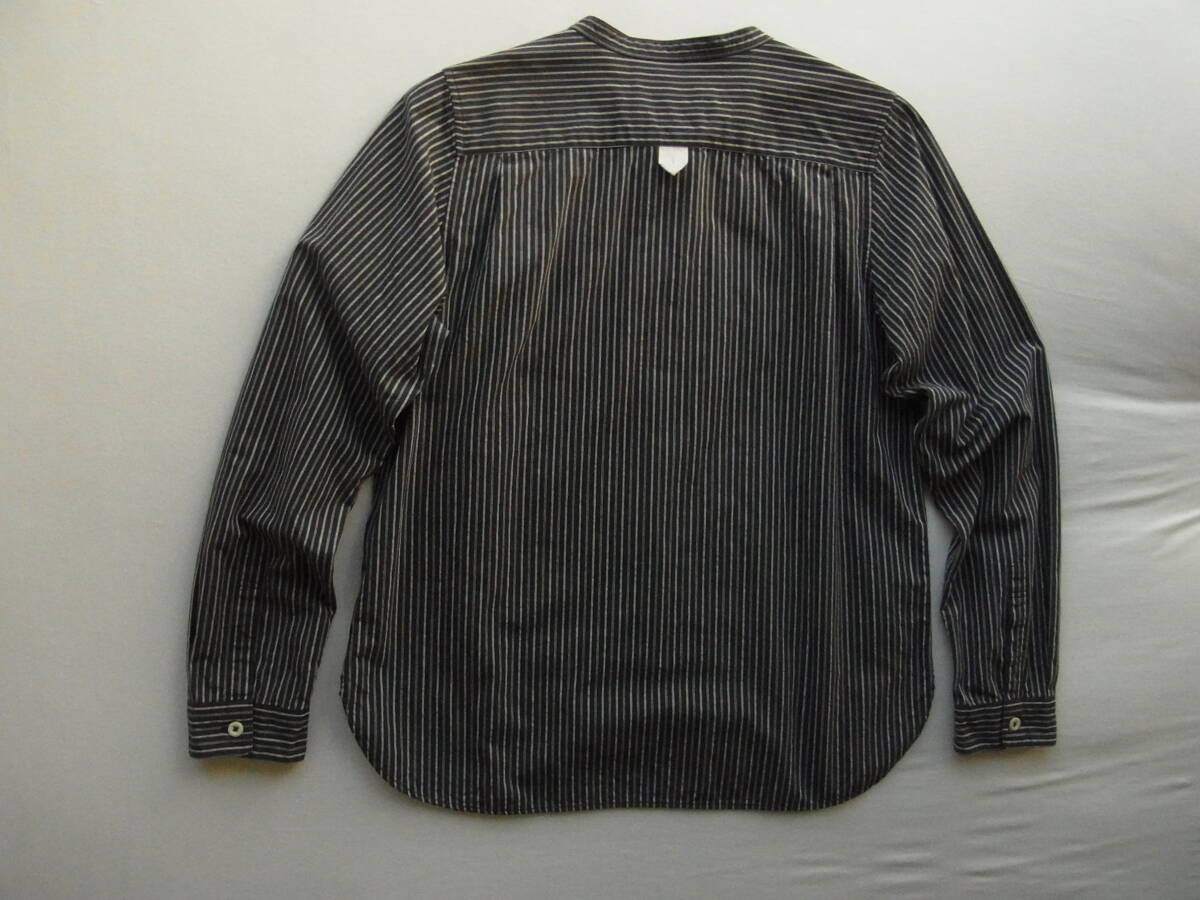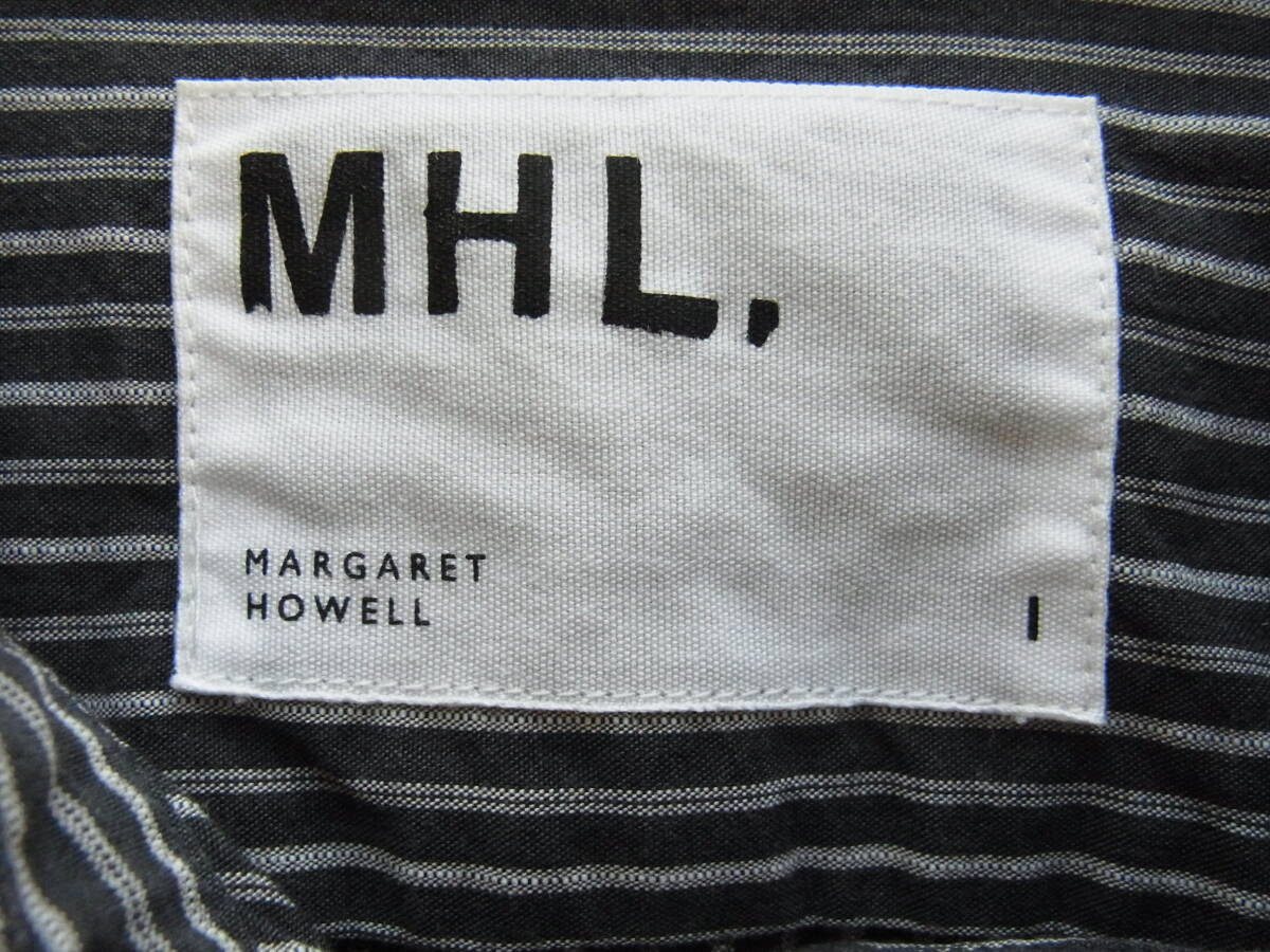 M H L.  マーガレットハウエルのストライプ柄でAラインのバンドカラーシャツになります。USEDで着用感御座いますが、特に目立ったダメージ等は御座いません。