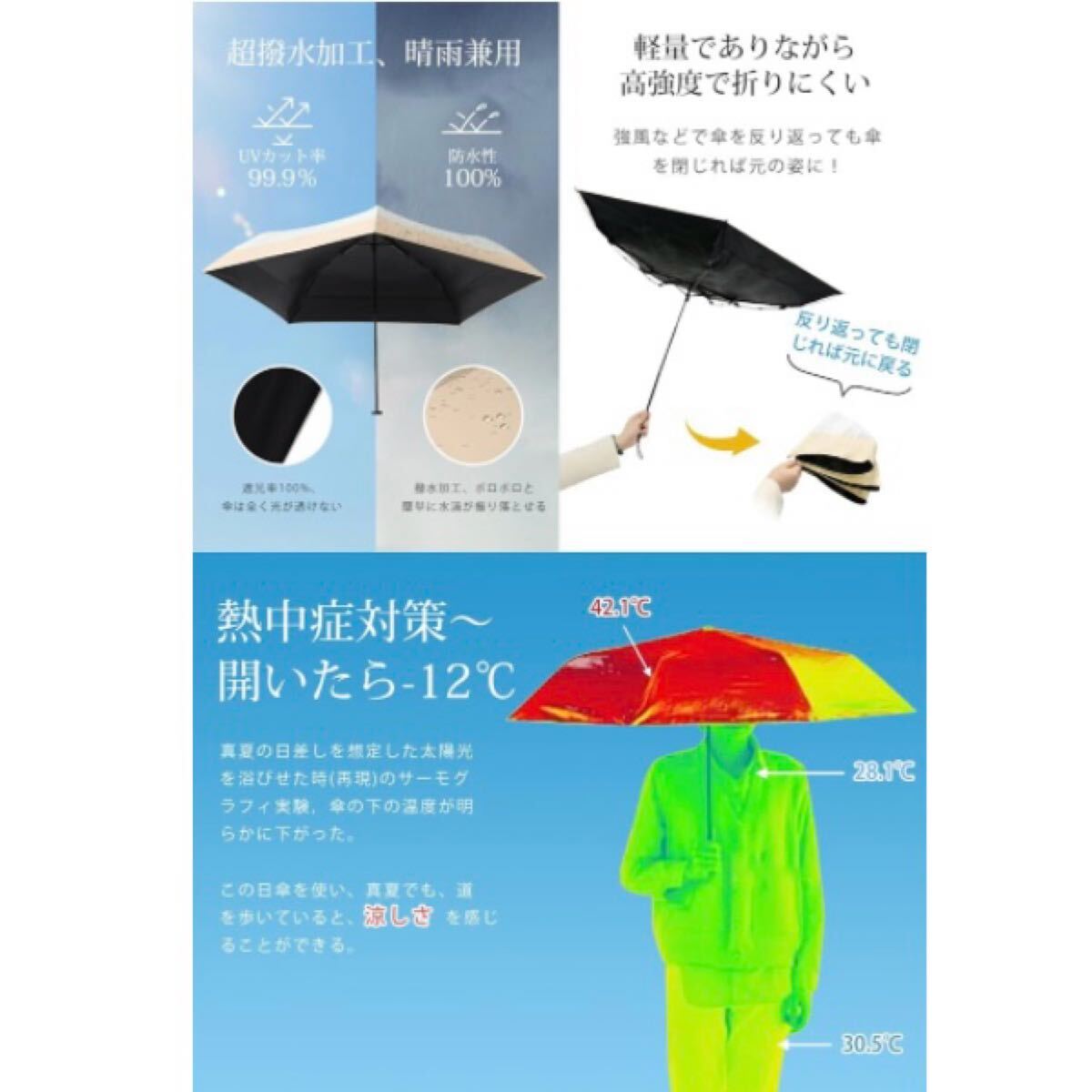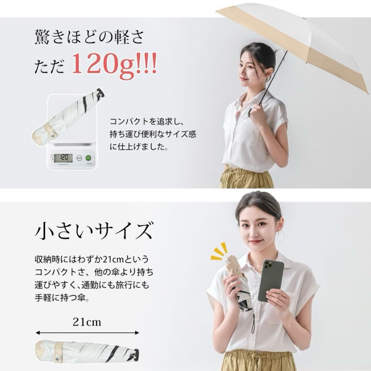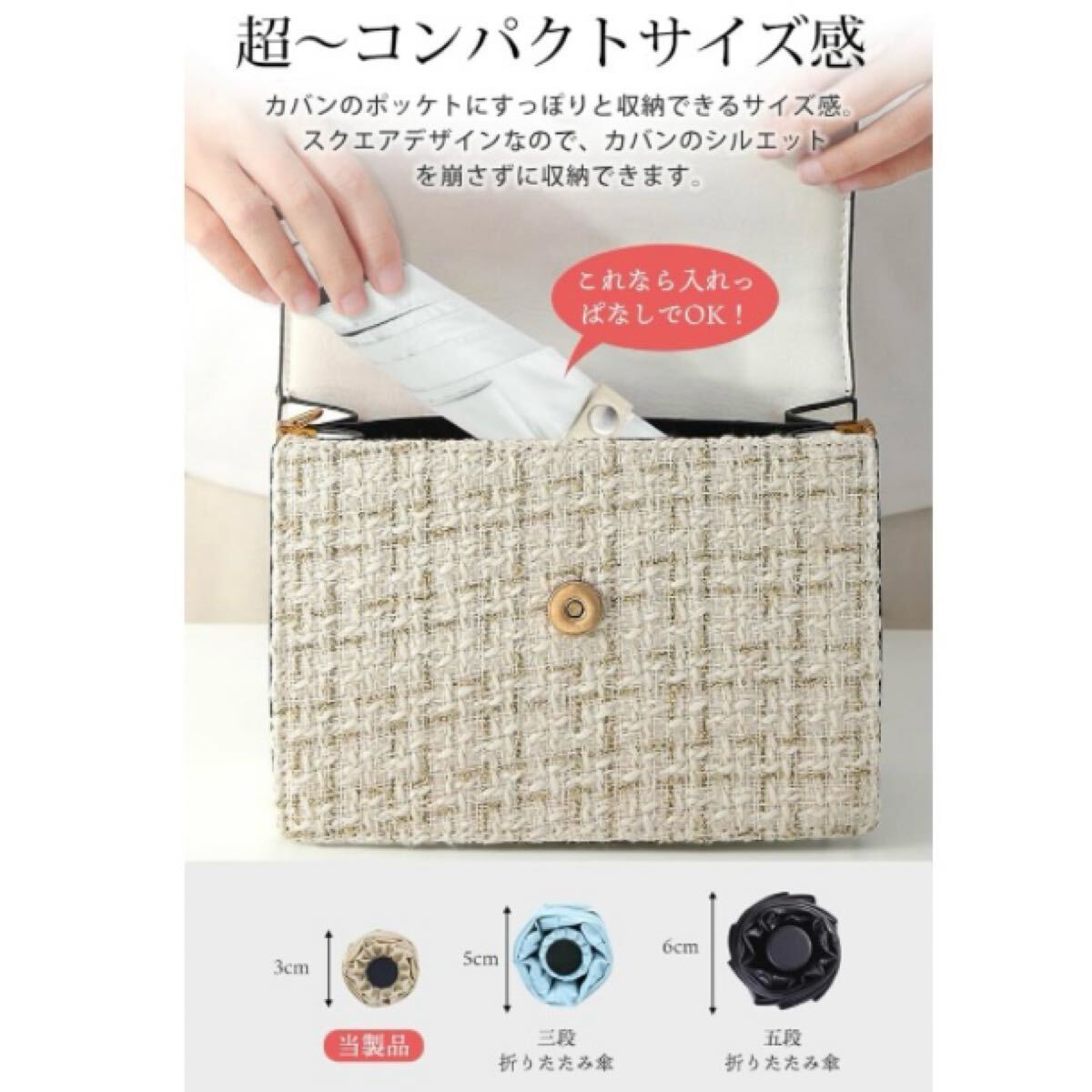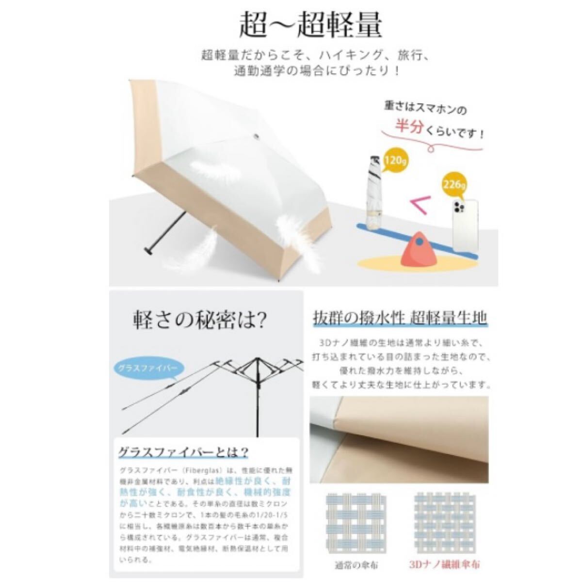 この3段折りたたみ日傘は、その軽さとコンパクトさで携帯性に優れています。留め具・ストラップ付きの収納ポケットもセットで、どこへでも気軽に持ち歩けます。