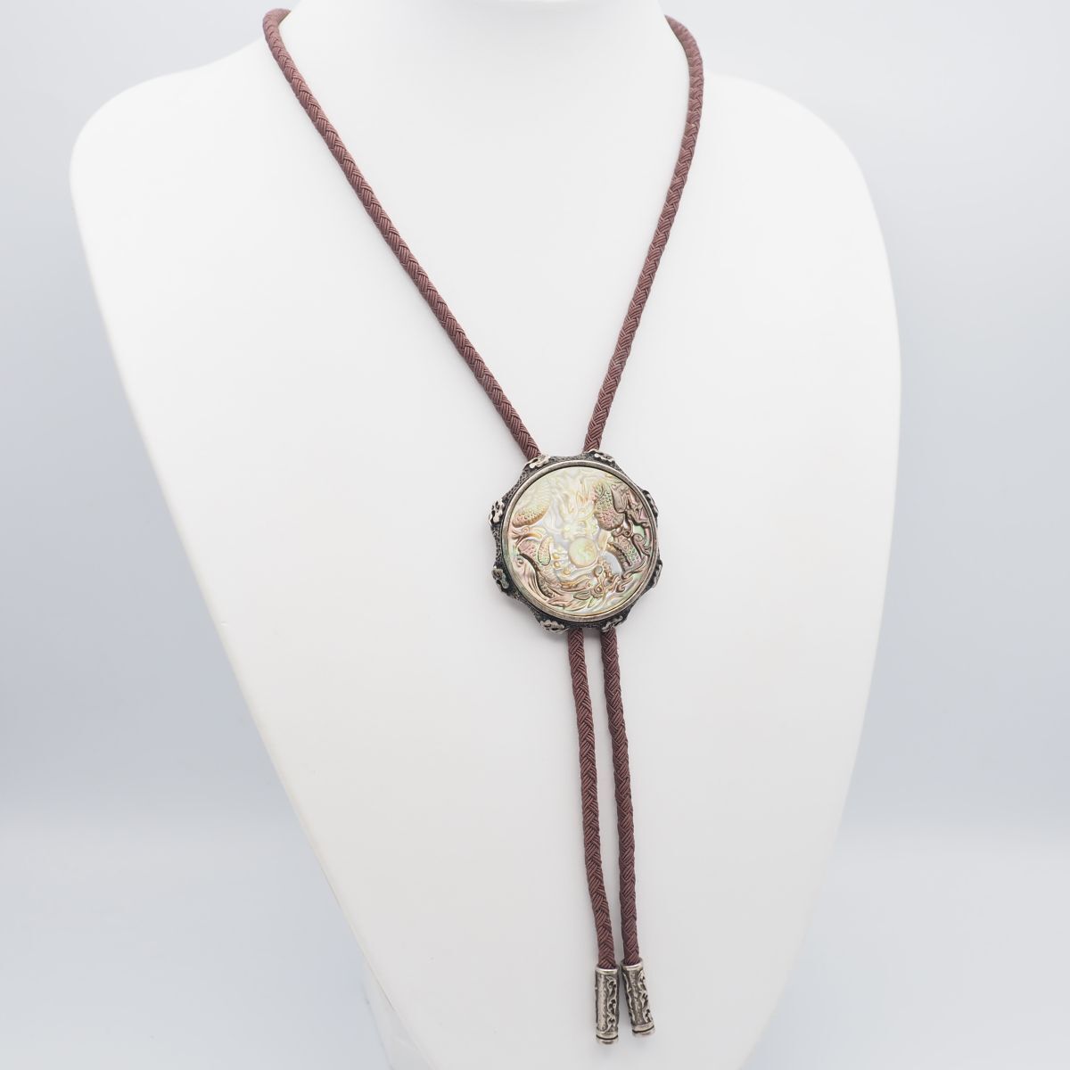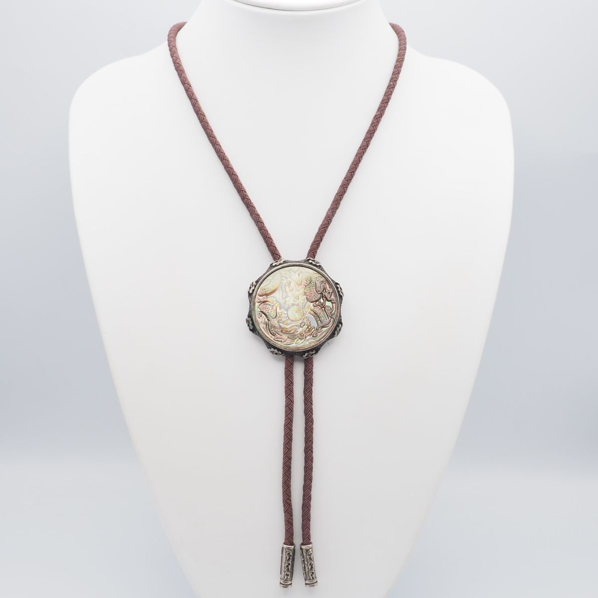 A042 シェルカメオ Shell Cameo KOREA刻印 ループタイ 龍 ドラゴン 彫刻 デザイン シルバー 紐タイ ネックレス アンティーク