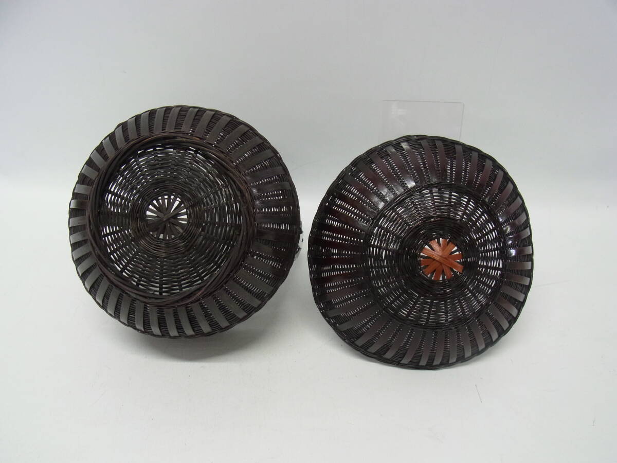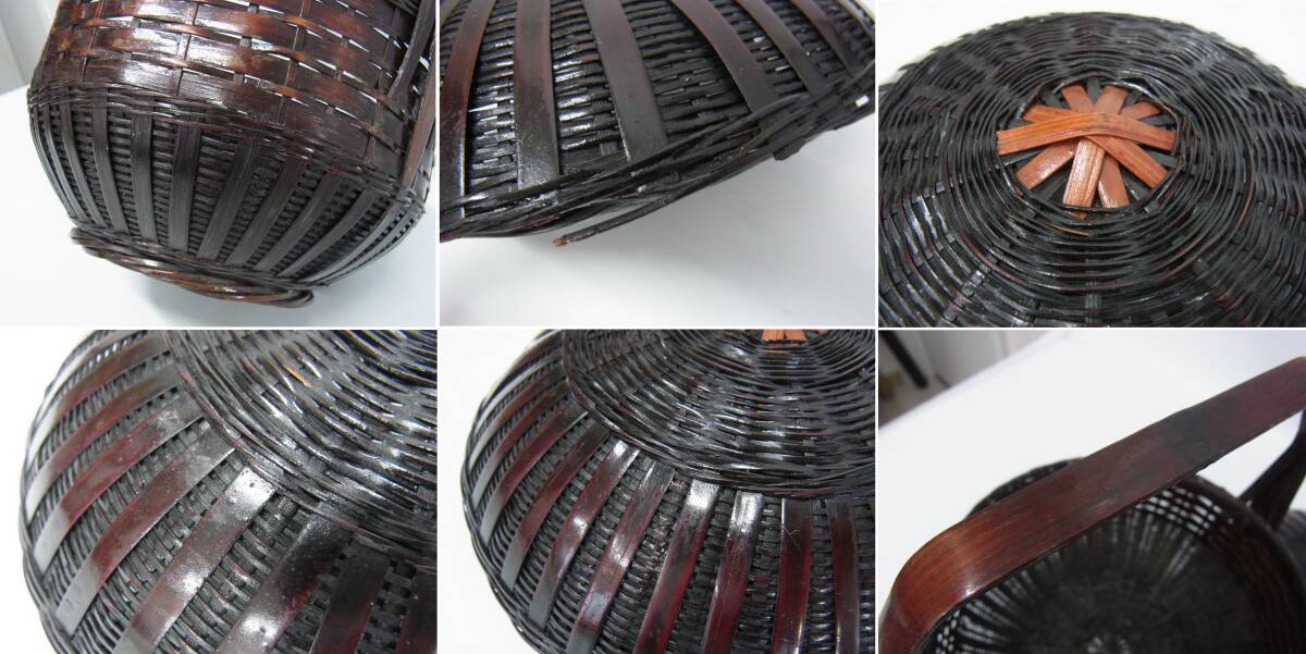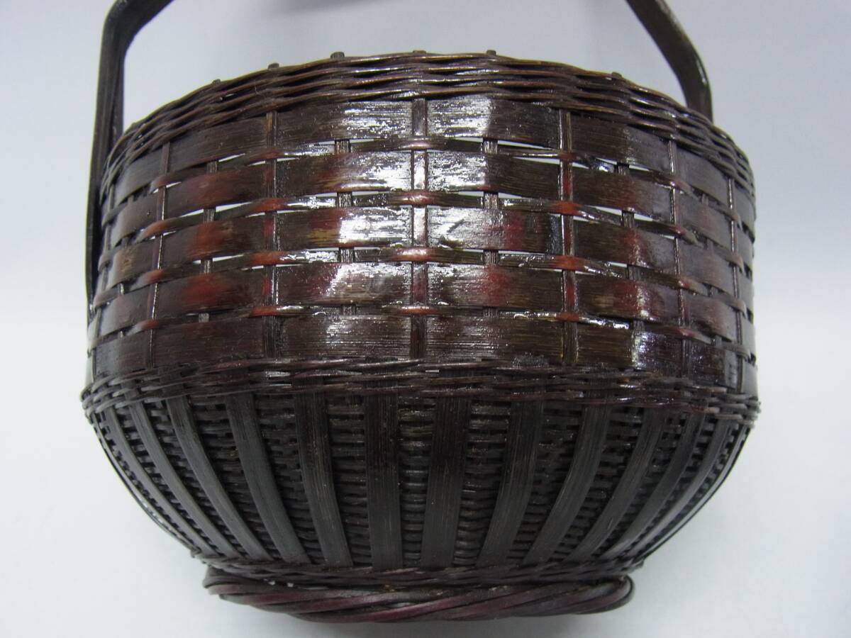 | 譲り受けた物で、本来の状態含め詳細は不明です。 おそらく竹製かと思いますが、 画像にてお詳しい方、お分かりになる方のご判断でお願い致します。 取手は外れませんが、内枠が外れています。 スレ・キズやワレ・ほつれ、汚れやゆがみなどございます。 現状でのお渡しとなりますので、メンテナンス・お手入れなど前提のうえ、 十分なご検討をお願い致します。 また、強度もわかりませんので、重さのある物を入れての持ち運びは おすすめしません。置物としてご活用頂ければと思います。 状態に関しましては画像でご確認いただき、ご判断をお願い致します。 気になる点はご入札前にご質問ください。 ※専門的な知識がありませんので、ご質問内容によっては お答え出来ない場合があるかもしれません。予めご了承ください。 上記内容含め、経年保管品になりますので、 ご理解いただける方のご入札いただけましたら幸いです。 撮影した照明により、色合いが多少違って見えるかもしれませんが、ご了承ください。 【サイズ】 口縁直径約16.5センチ 高さ約20センチ ※素人採寸です。多少の誤差はご了承くださいませ。 ※画像でもご確認ください。 ※画像では高さ約22cmのティッシュ箱と比較もしております。 【発送方法】 ・ゆうパック/80サイズ ---------------------------------------------------------------------- ※ゆうパックの送料はお届け地域によって送料が異なりますので、 気にされる方は必ずご入札前に「質問欄」よりお問い合わせください。 | |||