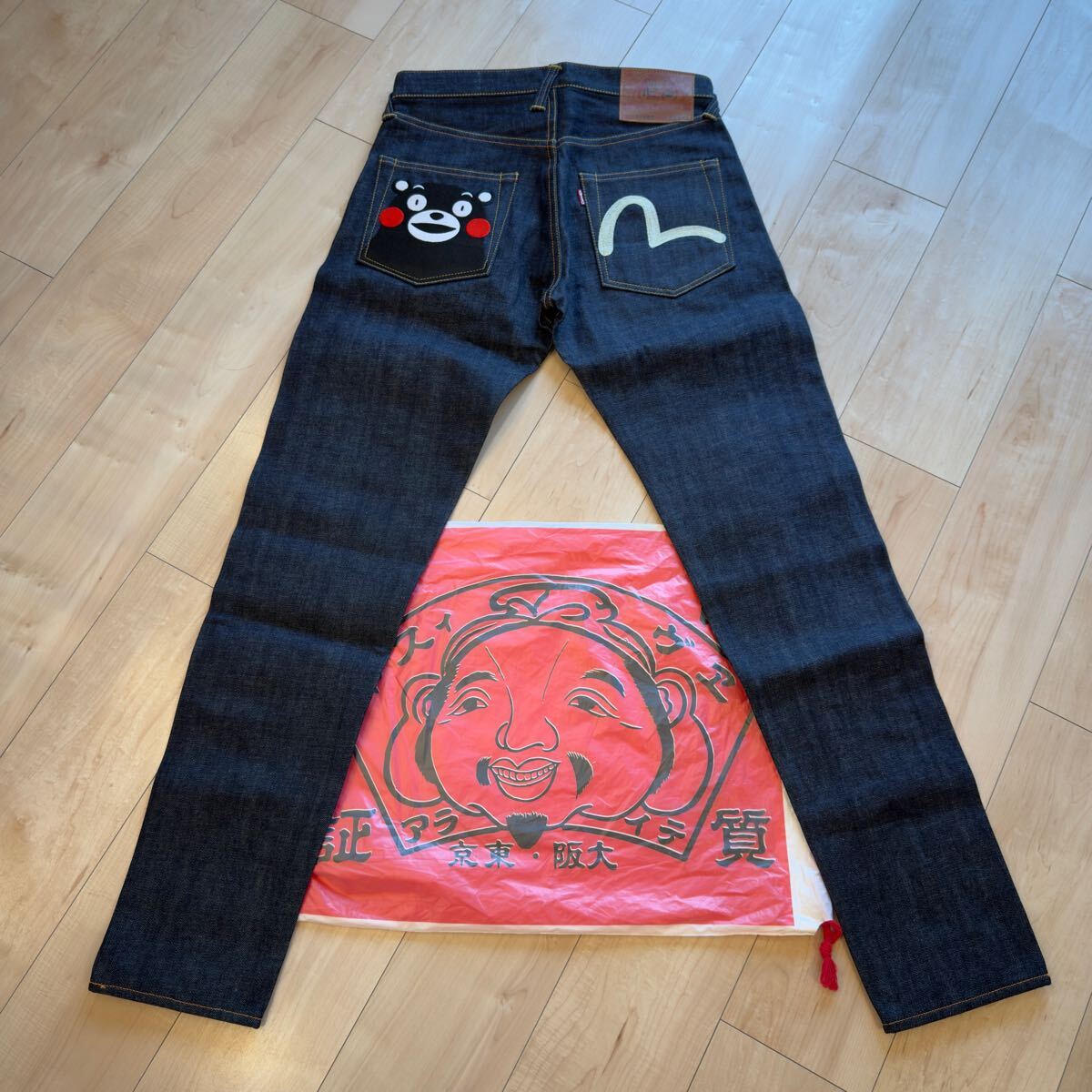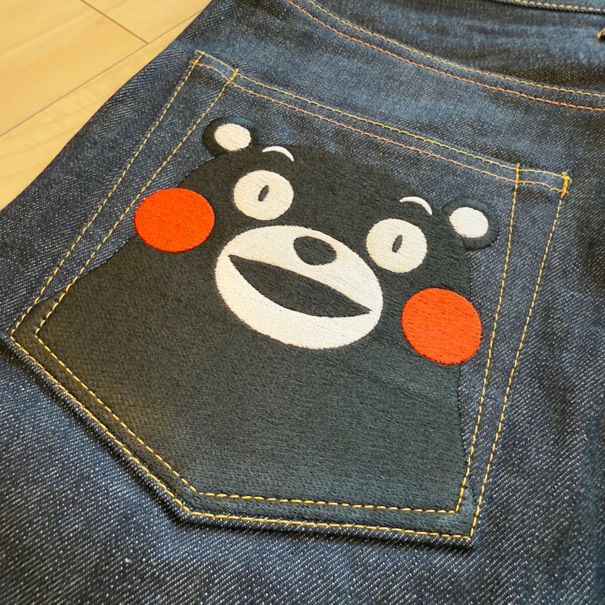 クマモンの刺繍が特徴のダークブルーデニムパンツ。