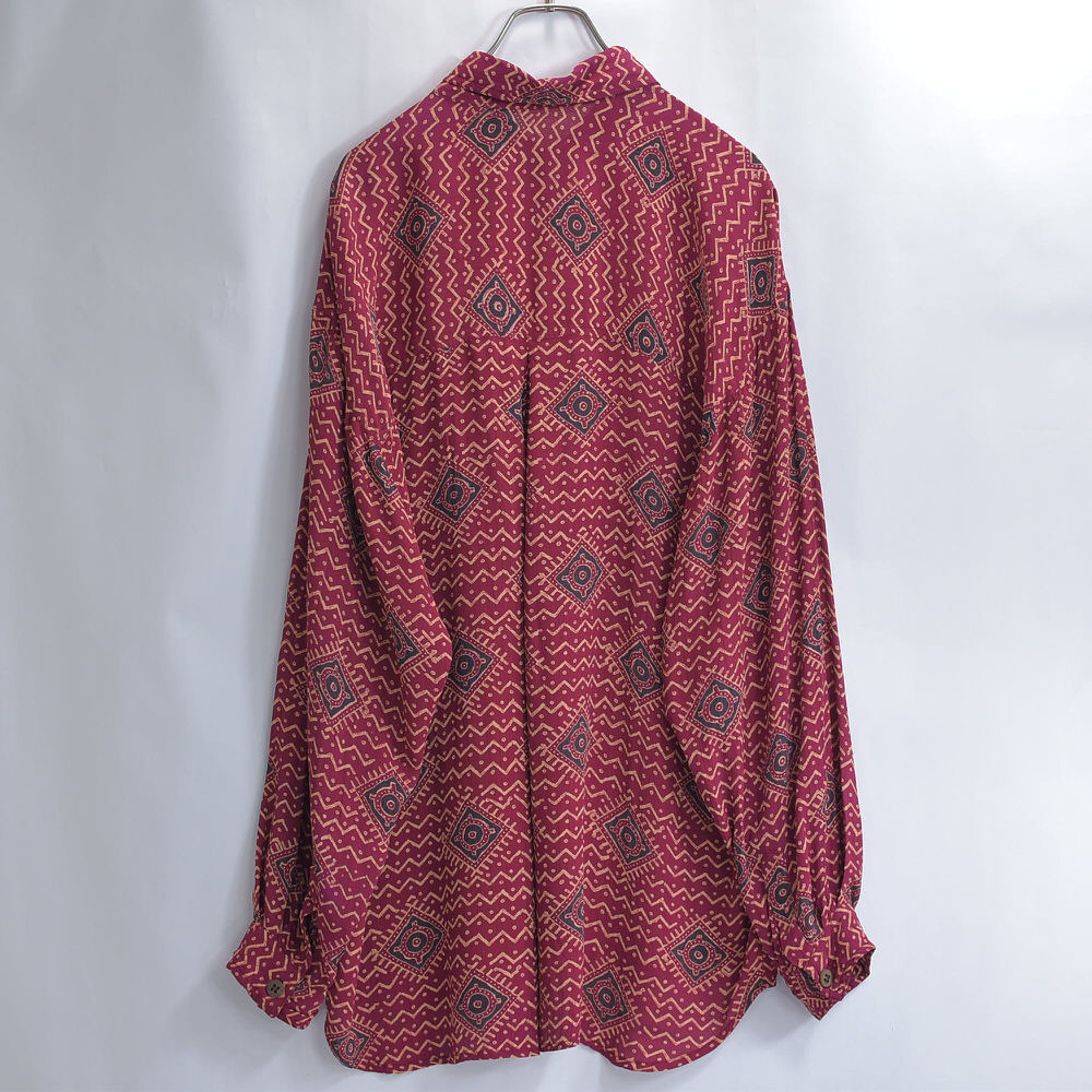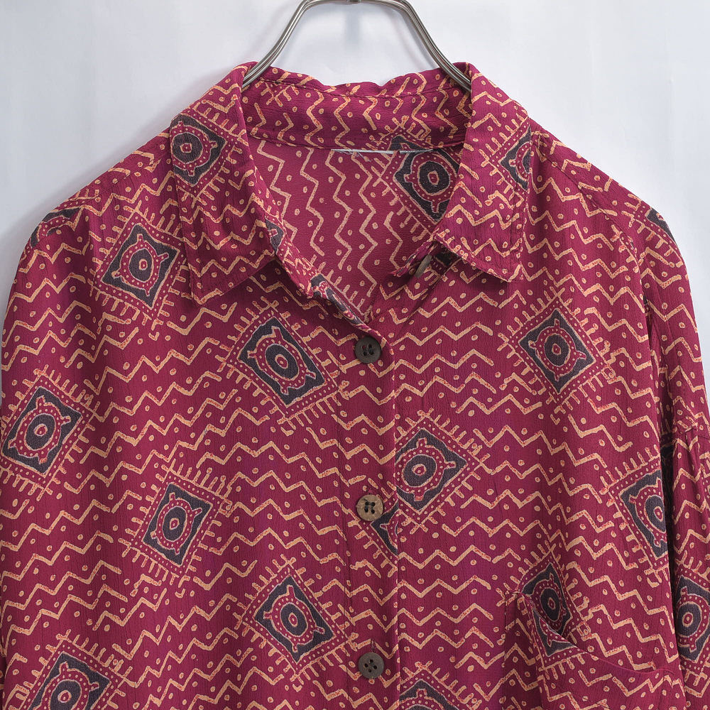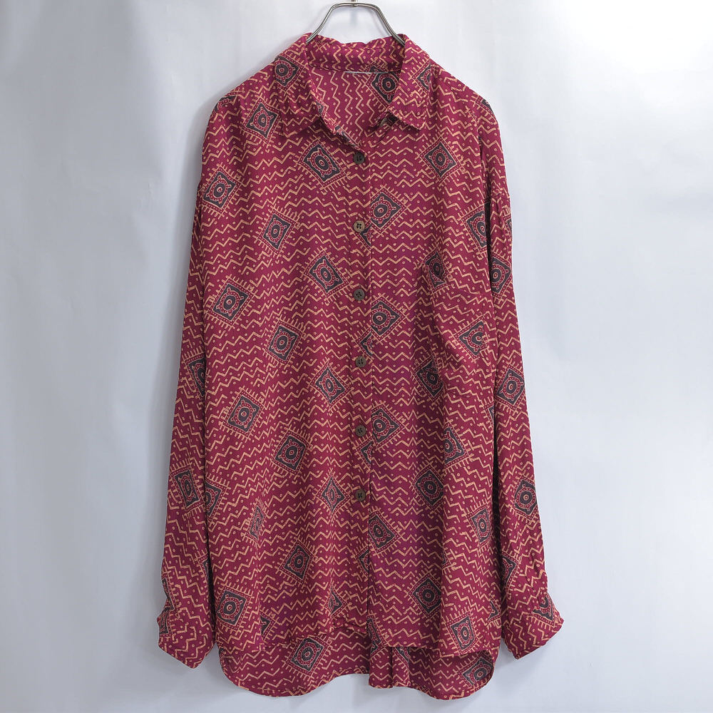 90~00s Trival patternトライバル柄 幾何学模様 総柄 ポリエステルシャツ ヴィンテージ 長袖 ビンテージ USA アメリカ古着 レディースXXL相当