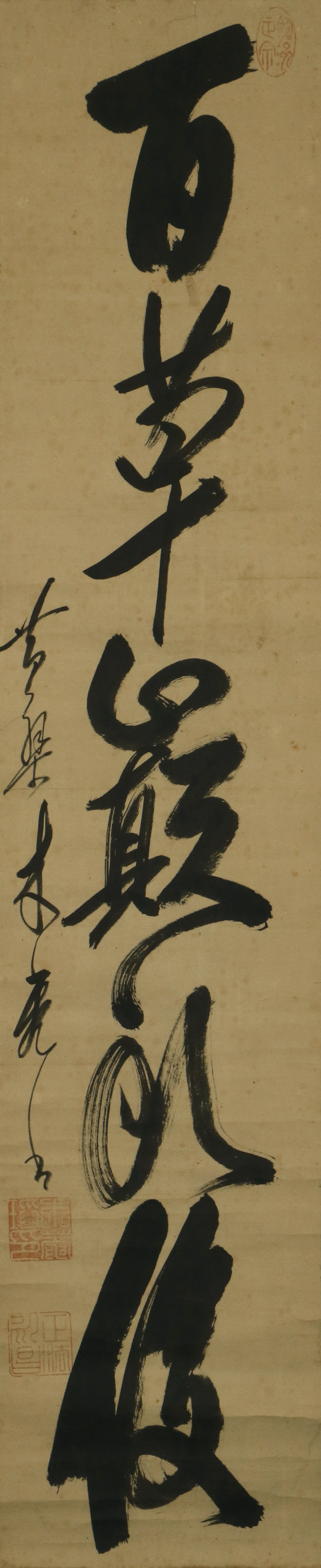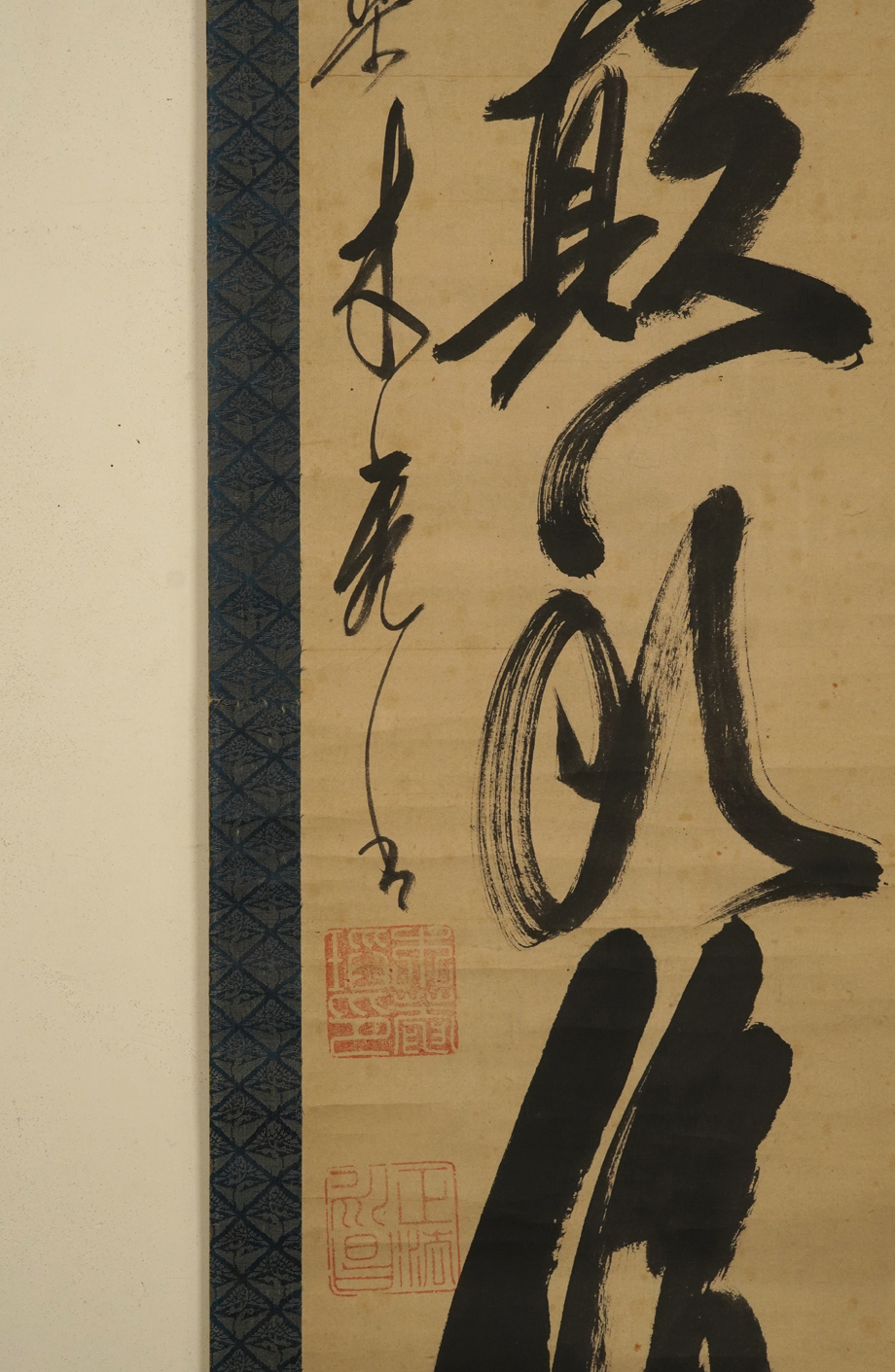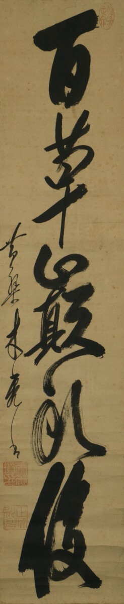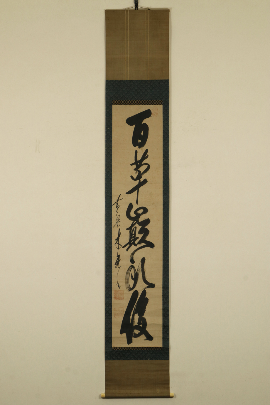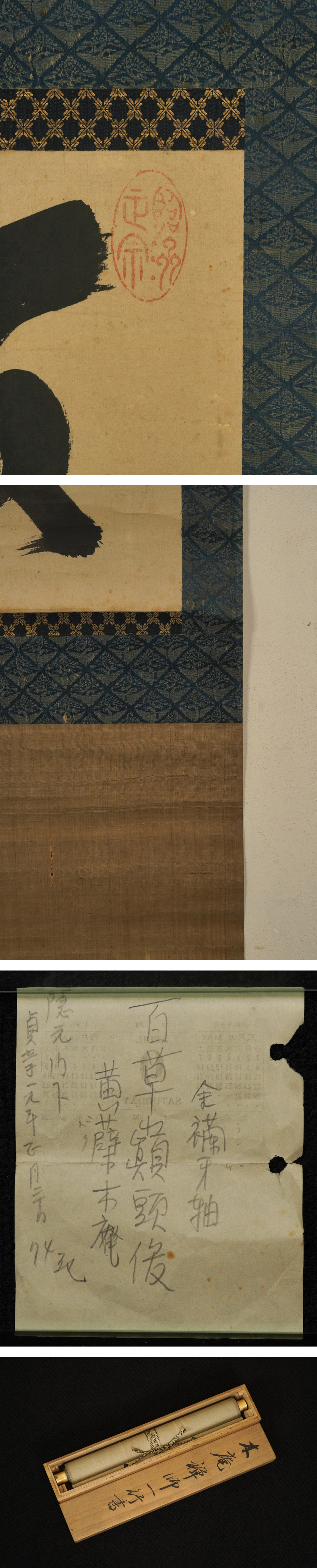 総丈サイズ…横 35.5 × 縦 213 cm 紙本・箱入 読み有 状態…少シミ・少オレ 【印刷ではありません】 【真作】 木庵性瑫 江戸前期の渡来禅僧。福建省生。木庵は道号、法諱は性瑫。黄檗隠元の法嗣。隠元の印可を受け剣石の太平寺住持、太平寺を法弟・即非如一に譲る。のち1655年隠元に招かれ来日、長崎・福済寺の住持となる。1660年摂津国・普門寺の隠元のもとに赴き1661年開創された宇治黄檗山萬福寺に入る。1662年即非如一とともに首座。1664年隠元を継ぎ萬福寺2世となる。1665年江戸で4代将軍・徳川家綱に謁見した。江戸紫雲山瑞聖寺など20余寺を開創、将軍より紫衣を賜わる。1680年萬福寺・紫雲院に隠退した。書は隠元、即非如一とともに黄檗三筆と称された。諡号は慧明国師。貞享元年(1684)寂、74歳。 |