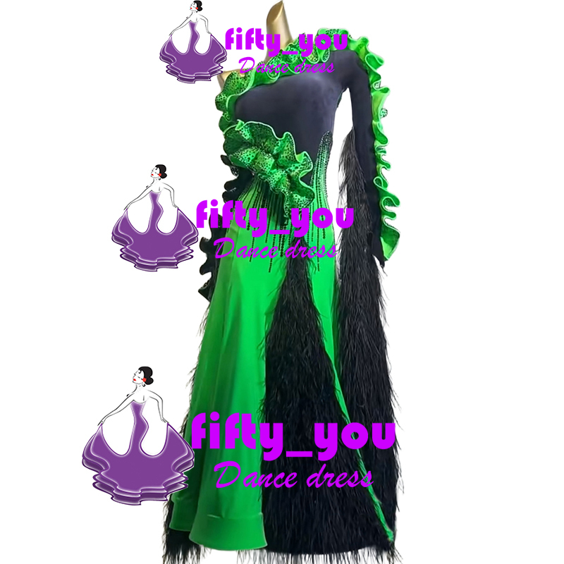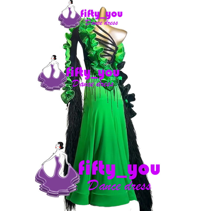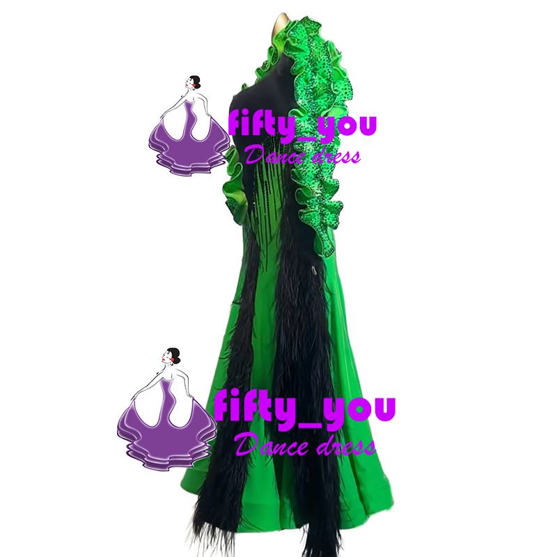 新品fifty_you レディース社交ダンス衣装 高品質モダンドレス セミオーダー スタンダードドレス 可愛いフリンジ飾り 緑と黒 羽付き