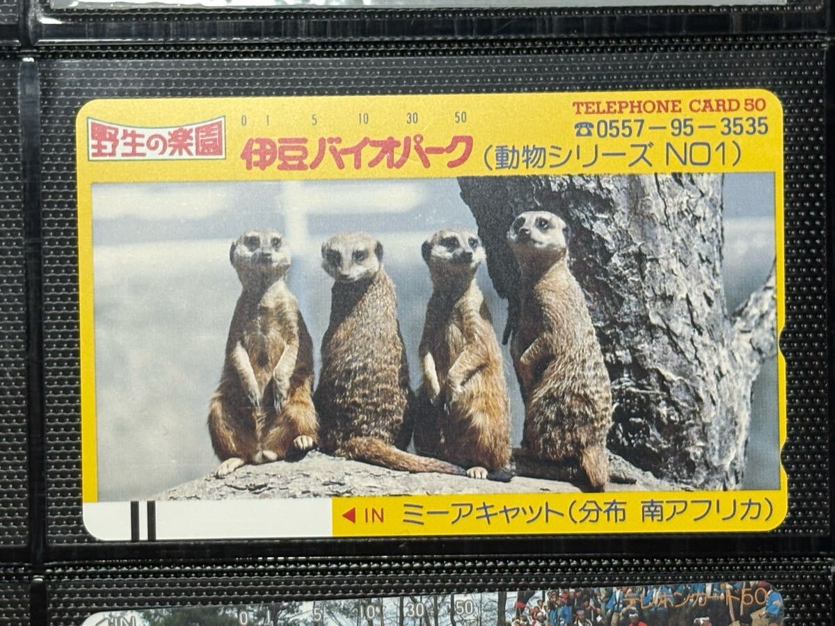 静岡・伊豆バイオパークで発行された、可愛らしいミーアキャットがデザインされたテレホンカードです。50度数仕様、未使用品。人気の動物・ミーアキャットをモチーフにした希少性のあるデザインで、動物好きの方やコレクターにおすすめです。絵柄がはっきりと楽しめる状態で保管されており、コレクションに加えるにふさわしい一枚です。