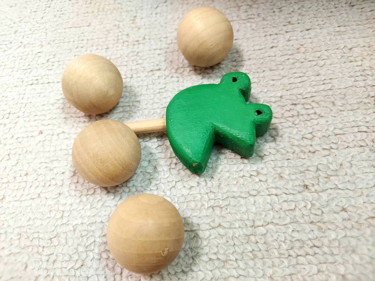 ◆キットで作ったハンドメイド品です。そうじきで隅なども吸い取りましたが、取りきれないほこりがあります。玉が小さめなので、お口におもちゃを入れるお子さまには向きません。玉は最初から4個でした。全体的には無垢材ですが、受けのカエルあごに塗装のはげが少々あります。かえるは普通の塗料かアクリル絵の具で塗った気がしますのでやはりお口に入れるお子さまには向きません。