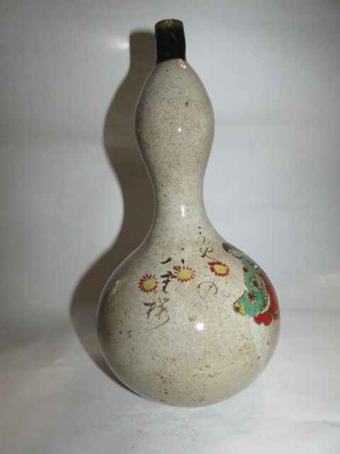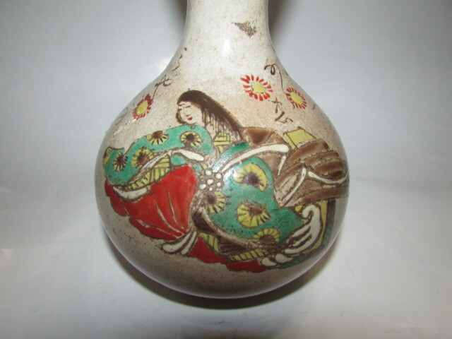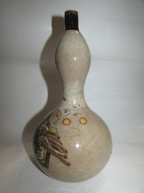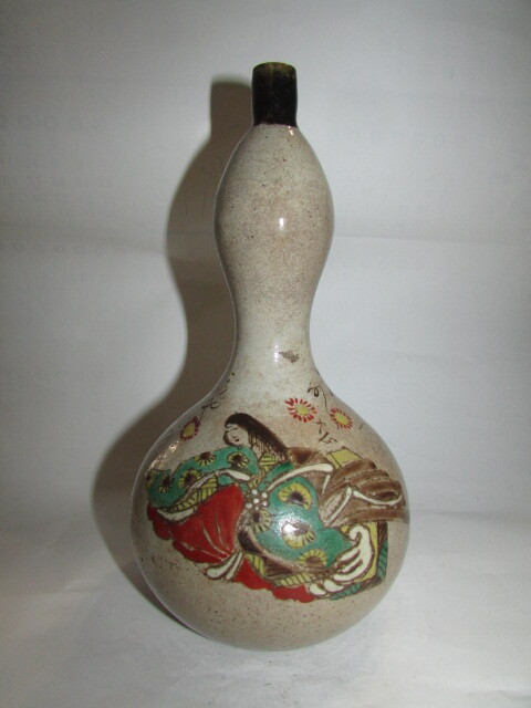 即決商品・(仙台・旧家・蔵出し)江戸時代後期-明治時代(古い時代の大堀相馬焼・色絵十二単人物に和歌模様瓢箪徳利)完器・貴重・大珍品