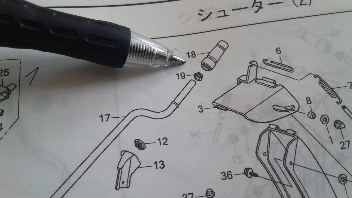 ◎手動シュータハンドル用です。注意して下さい。 画像2枚目のペンの差す18/19のシューターハンドルグリップ パーツです。 先に19のブッシュをシャフトに入れてから18のグリップと結合させて下さい。シャフトに入れる前に18・19を結合させるとシャフトにはまらなくなります。 パーツリスト上、適合機種 HS80/HS80K1 HS660K1/K3 HS760/HSS760 HS870K1~K3 |