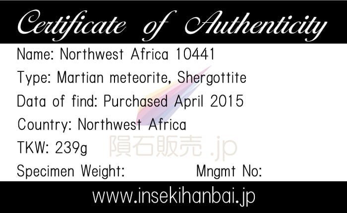 正式な隕石名はNorthwest Africa 10441です。2015年4月から5月にかけてアフリカ大陸北西部にある隕石マーケットでBrahimTahiri氏、DustinDickens氏、SeanTutorow氏が総質量239gの6つの塊を購入した後にアメリカにあるニューメキシコ大学にサンプルが送られC.Agee氏が分析・分類したことで正式に隕石として認められ登録されました。ニューメキシコ大学には20.5gが収蔵されていますがSeanTutorow氏がほとんどを塊を保有しています。