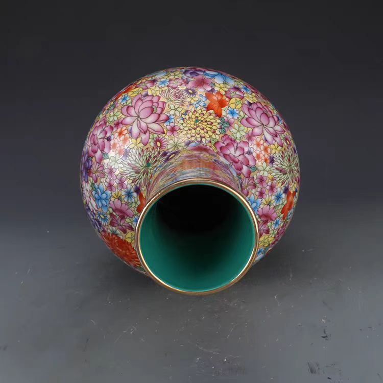 清時代 雍正年製款 古陶磁器 金地 粉彩 花卉紋 天球瓶 花瓶 賞瓶 磁器 文案置物 擺件 時代物 古董品 骨董 旧家蔵出 唐物 中国古玩 古美術品