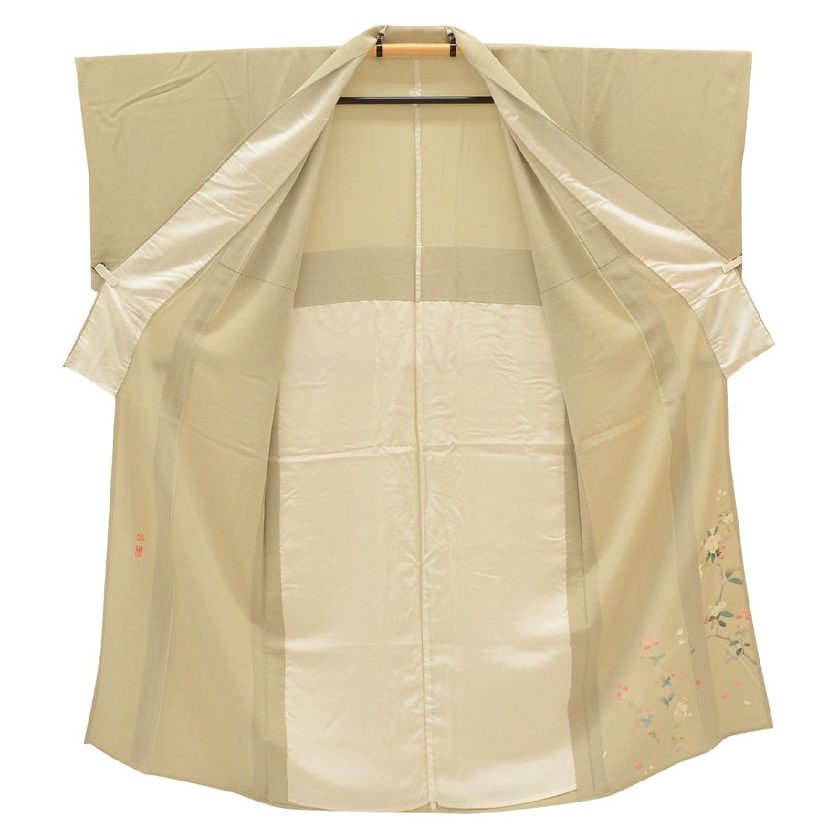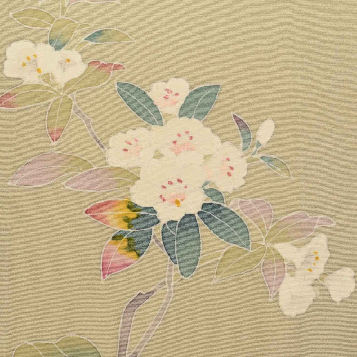 渋い緑色に花文様が施された上品さが感じられる一つ紋付きのリサイクルの付下げです。