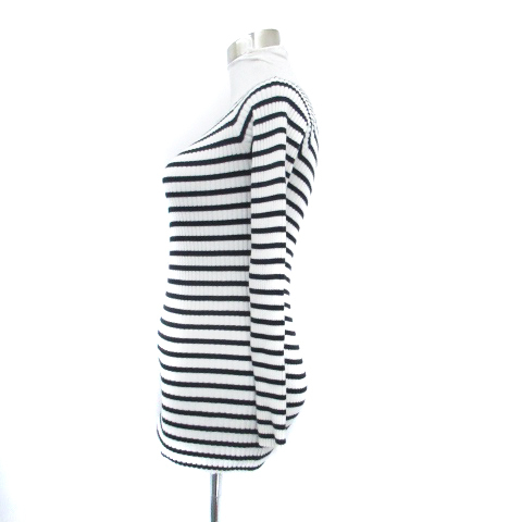 ナチュラルビューティーベーシック リブニット カットソー ラウンドネック 長袖 ボーダー柄 M オフホワイト 黒 ブラック レディース