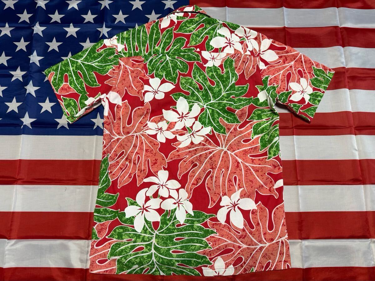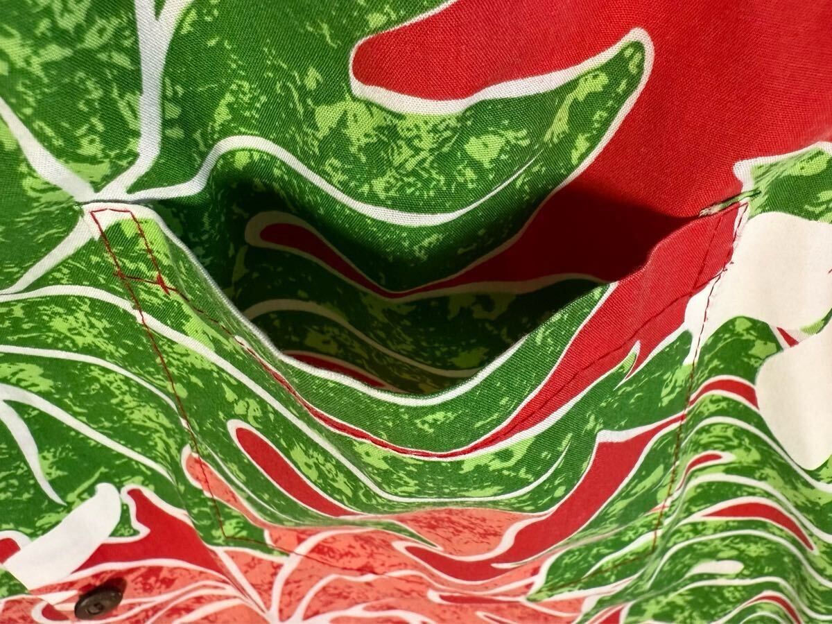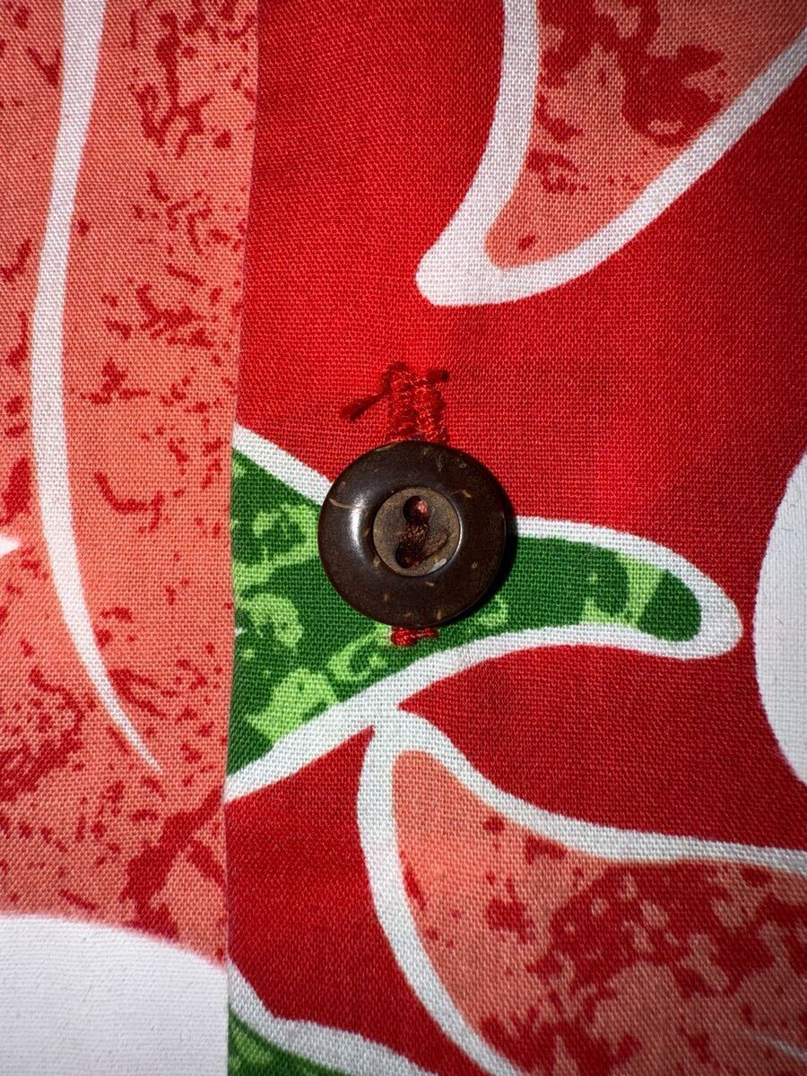 色鮮やかなトロピカル柄のココナッツボタンが使用されたアロハシャツです。