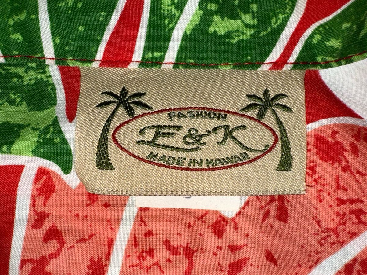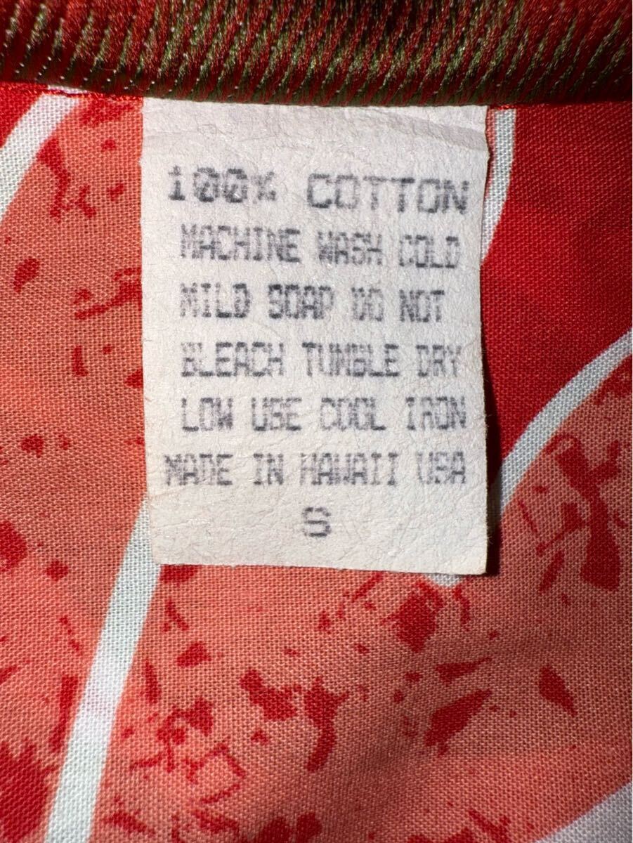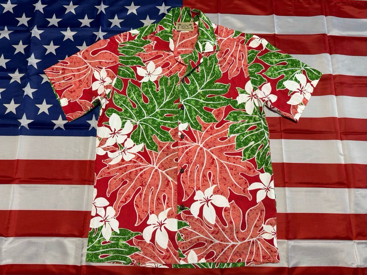 色鮮やかなトロピカル柄のココナッツボタンが使用されたアロハシャツです。