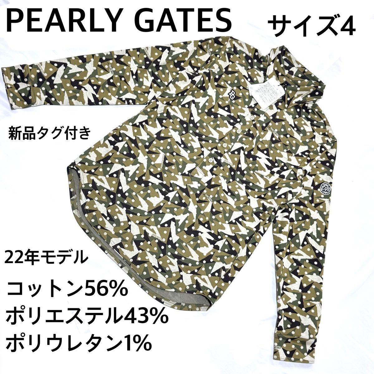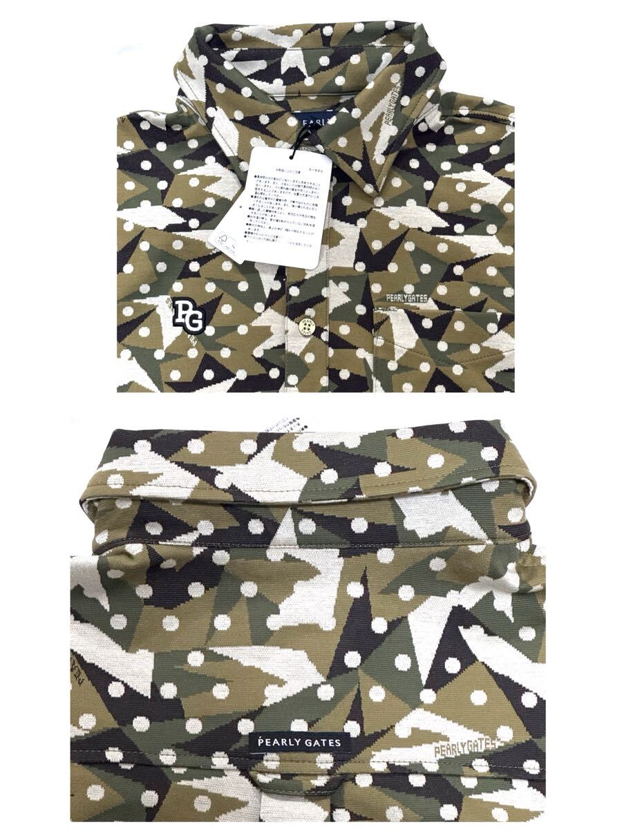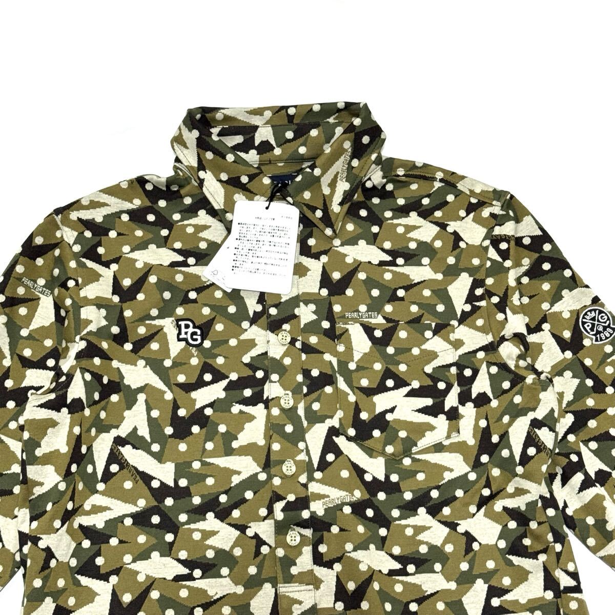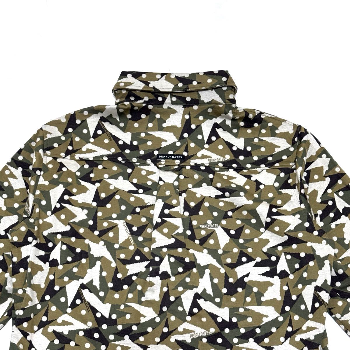 2022年モデルのPEARLY GATES長袖ゴルフシャツ。カモフラ柄とドットの組み合わせが個性的でおしゃれ。ストレッチ性が高く、プレー中も快適です。胸元のロゴ刺繍や左袖のワッペンもアクセントになっており、タウンユースにもおすすめです。新品タグ付きの希少なアイテムで、プレゼントにも最適です。