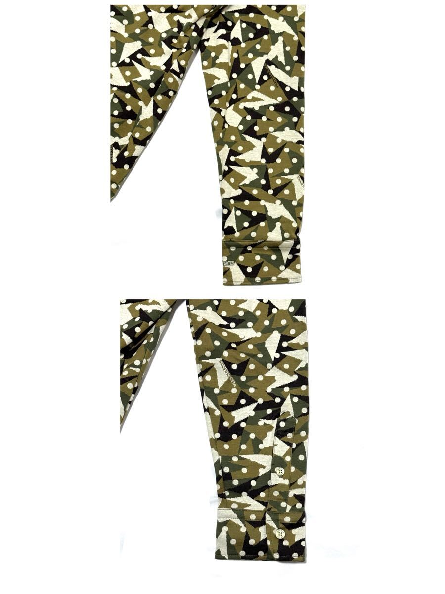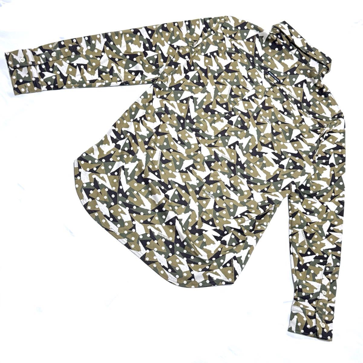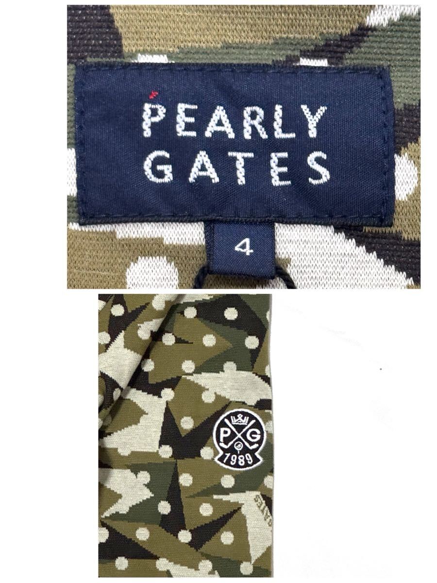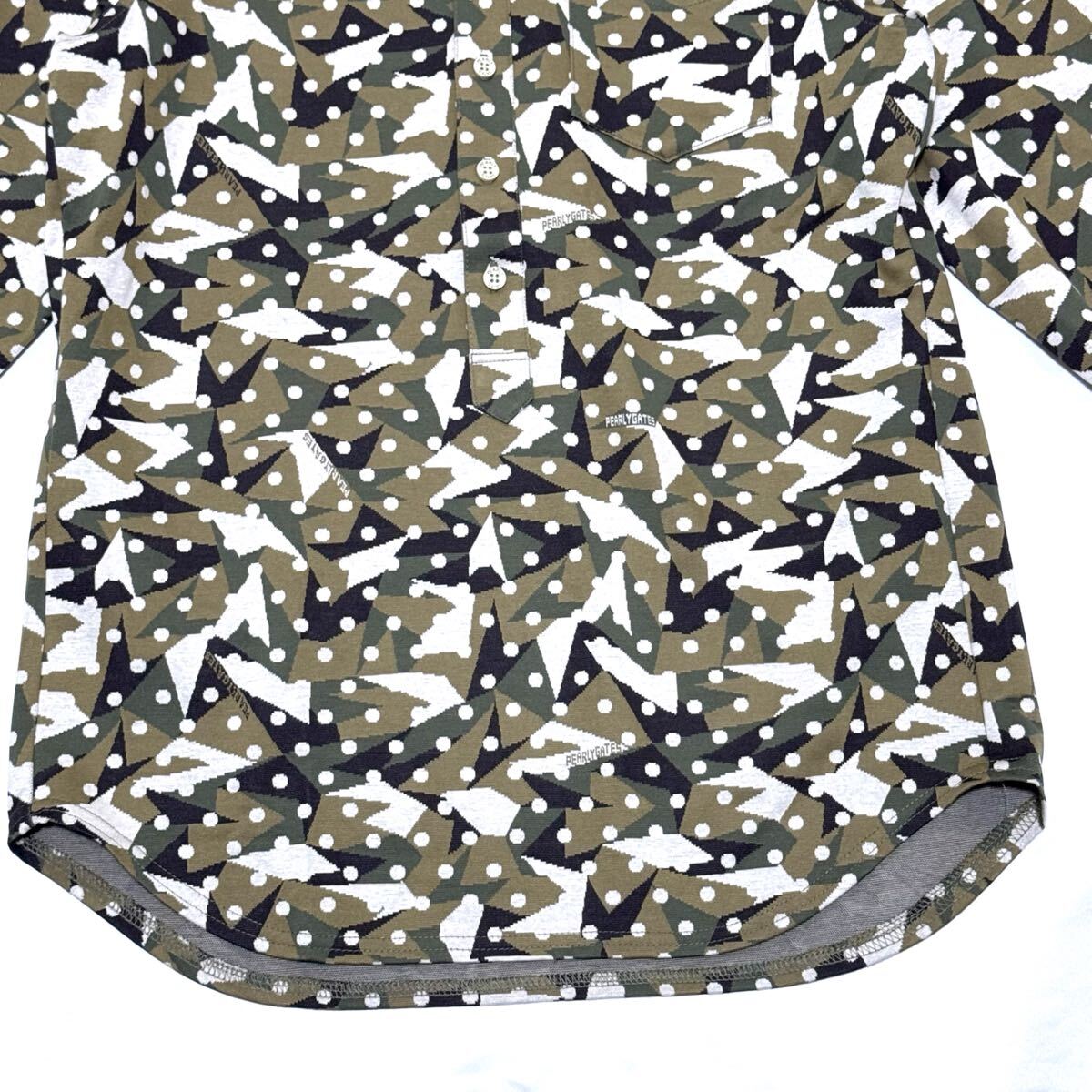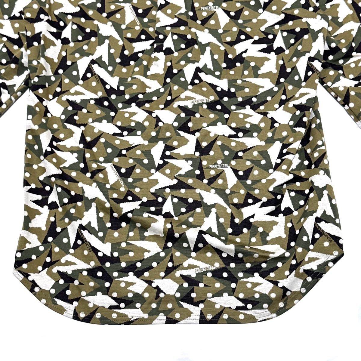 2022年モデルのPEARLY GATES長袖ゴルフシャツ。カモフラ柄とドットの組み合わせが個性的でおしゃれ。ストレッチ性が高く、プレー中も快適です。胸元のロゴ刺繍や左袖のワッペンもアクセントになっており、タウンユースにもおすすめです。新品タグ付きの希少なアイテムで、プレゼントにも最適です。