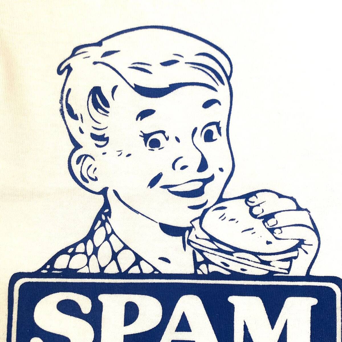 ★スパムむすび等でお馴染みの、アメリカのポークランチョンミート"SPAM"のレトロポップな男の子のキャラクターのプリントTシャツです。