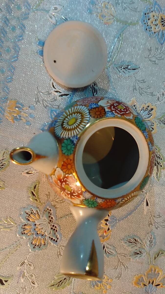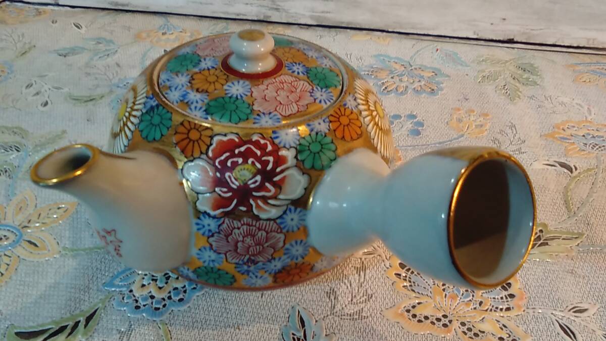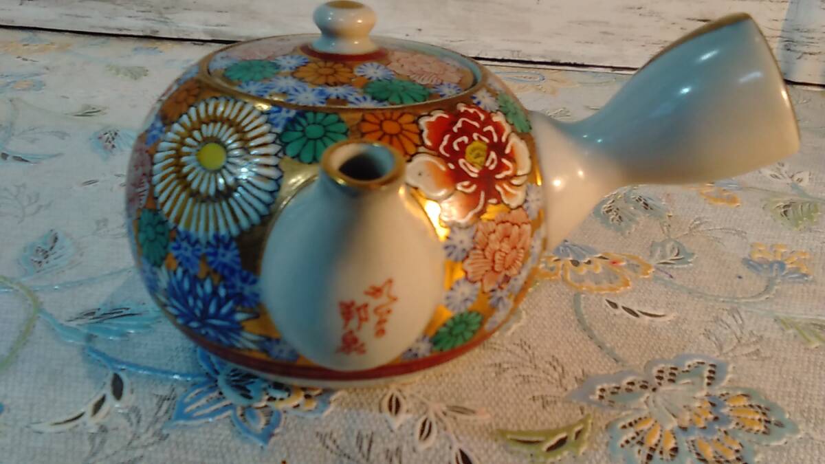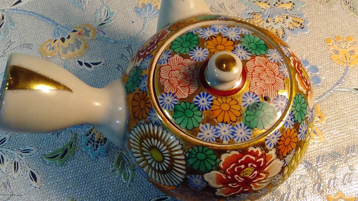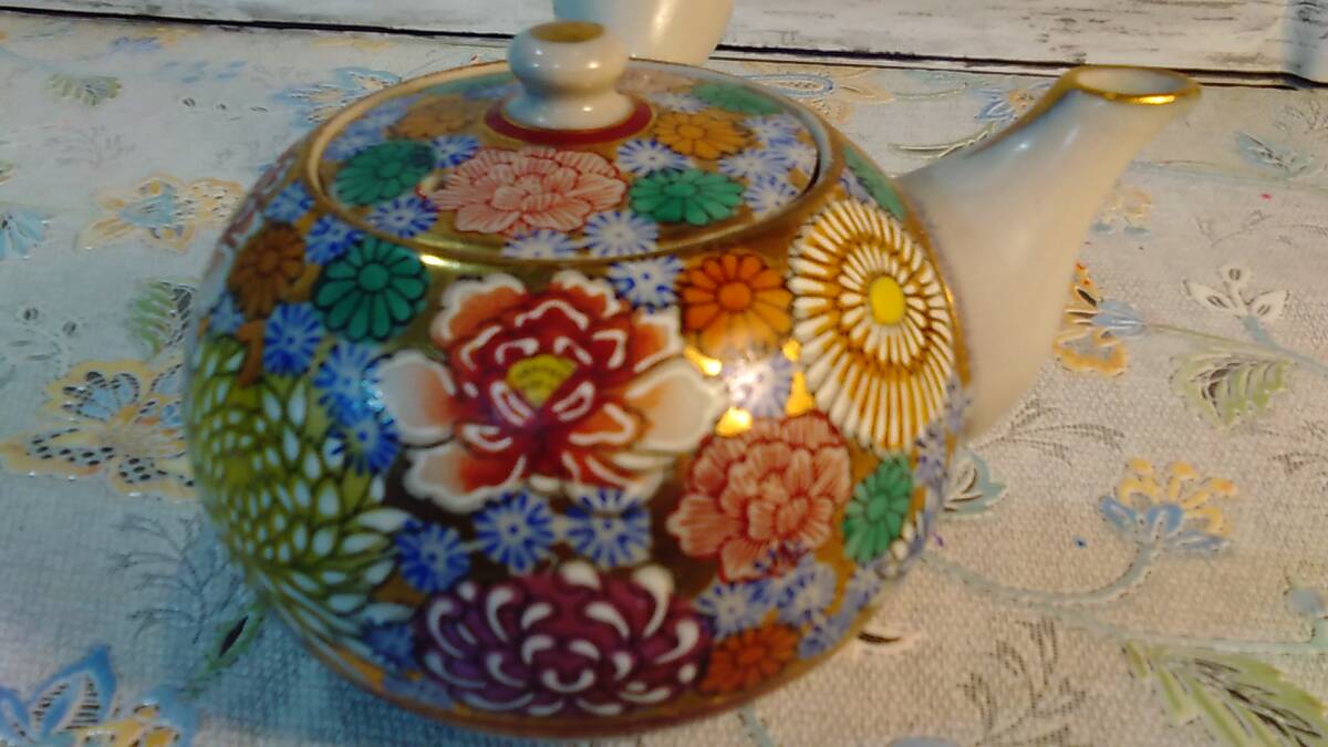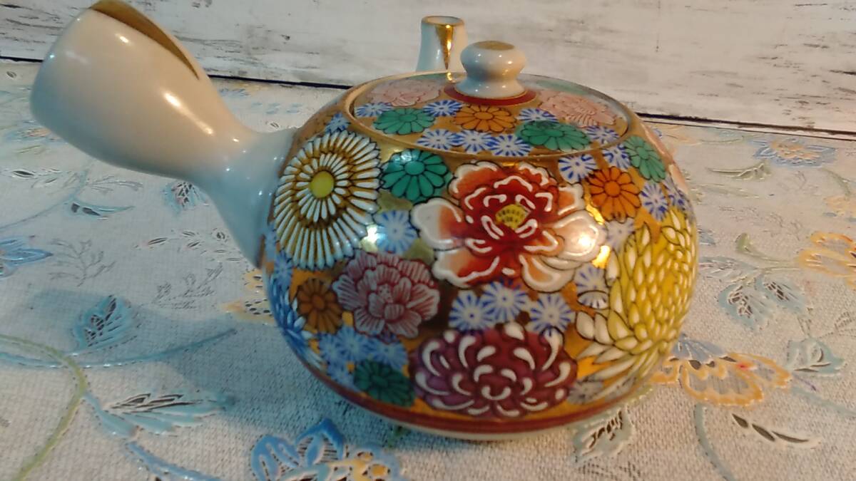 金彩の牡丹や菊の模様が描かれた華やかな急須です。