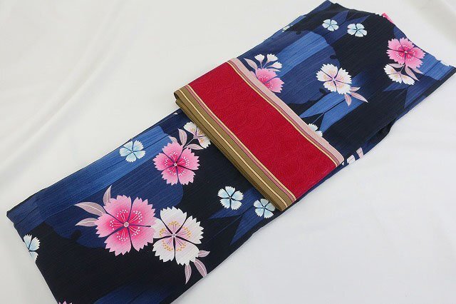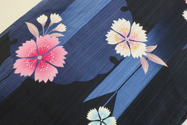 浴衣と帯の2点セットです。 【浴衣】 紺色の矢絣柄の木綿地に撫子が描かれた大人浴衣です。 |
