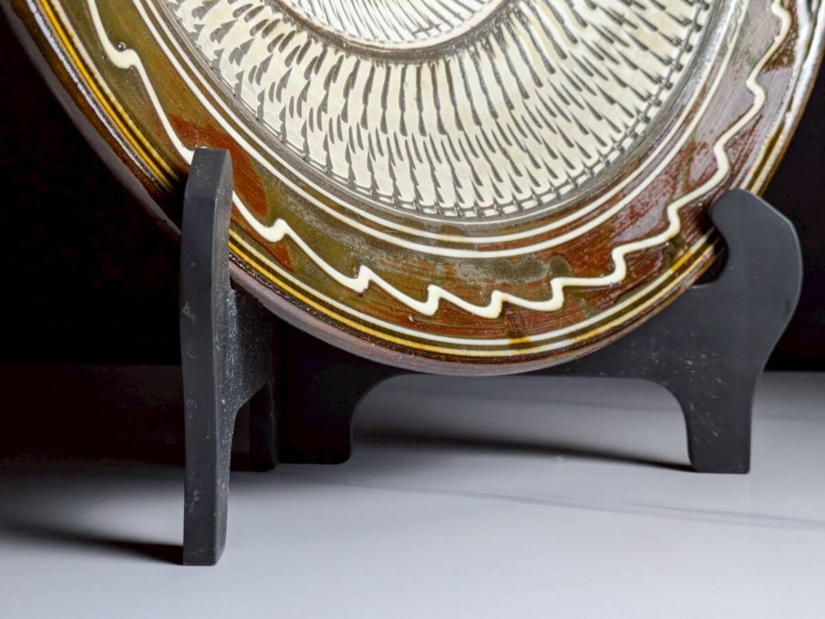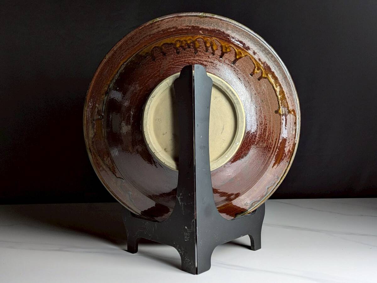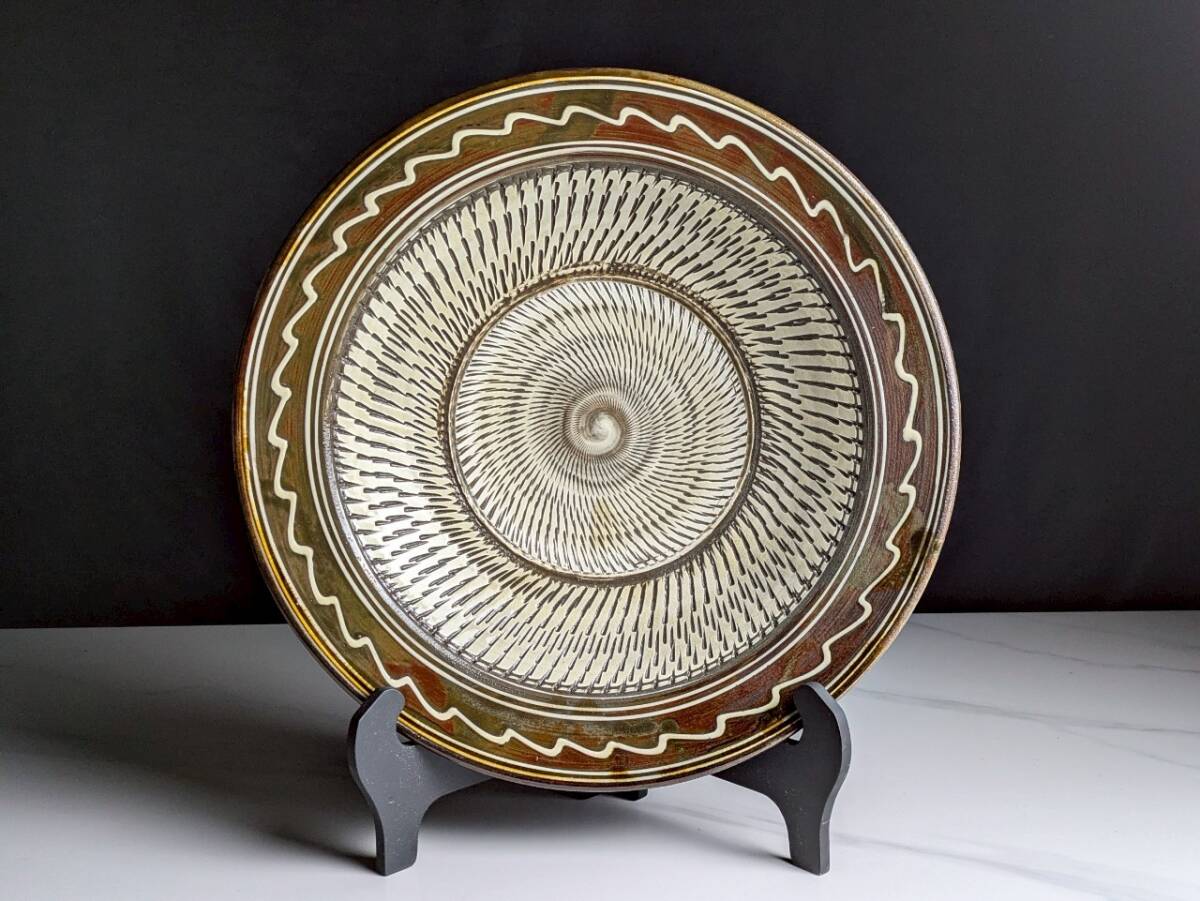重要無形文化財◆小鹿田焼 飾り大皿 1尺1寸(43.5cm)◆飛鉋印毛目 皿立付 日本伝統工芸美術品 飾皿 流し掛 窯傷? 焼き物 大作