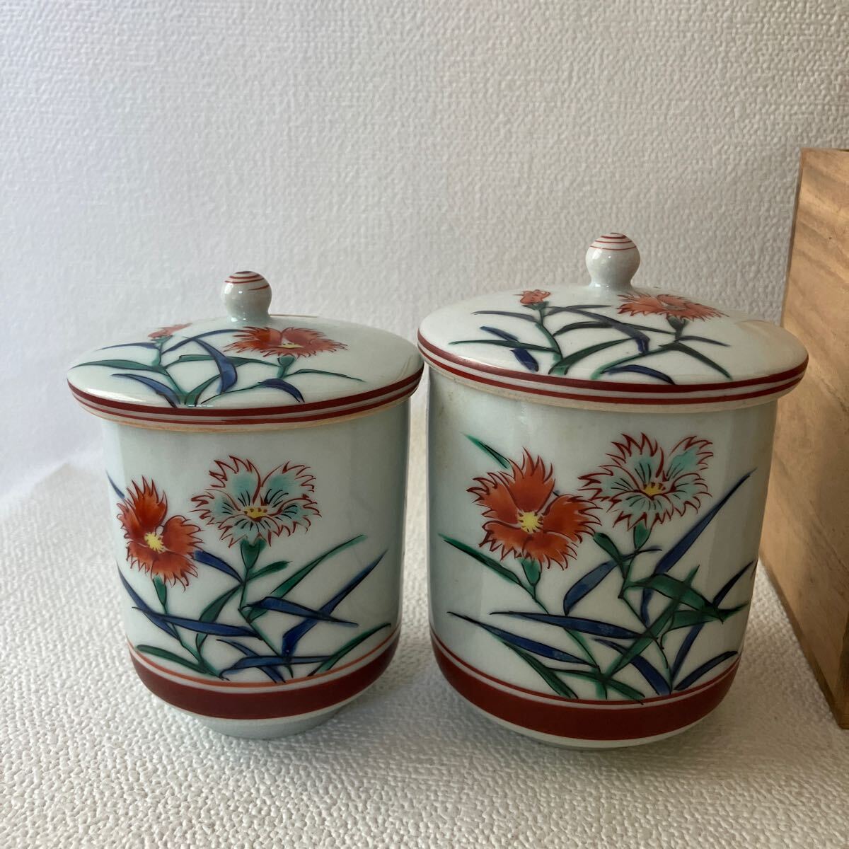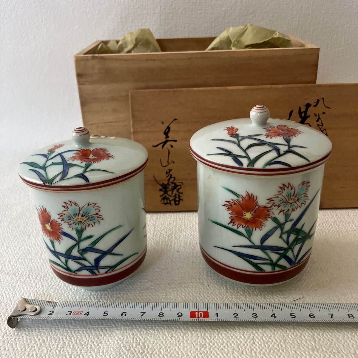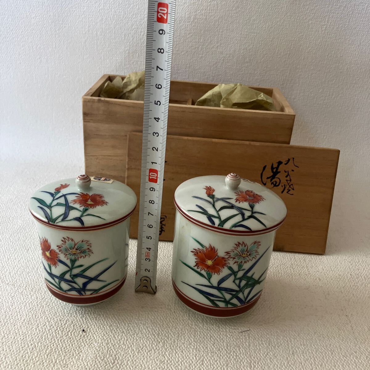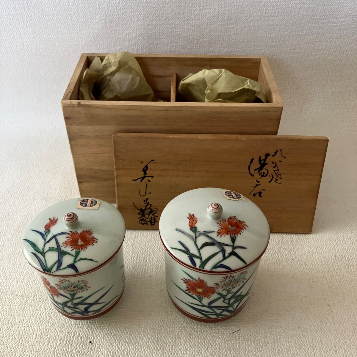 c777 60 九谷焼 湯呑 夫婦 セット 和食器 木箱入り 陶器 ゆのみ サイズ違い 蓋付き 花柄 美山 汚れ有り 和風 和柄 日本 和室 コップ
