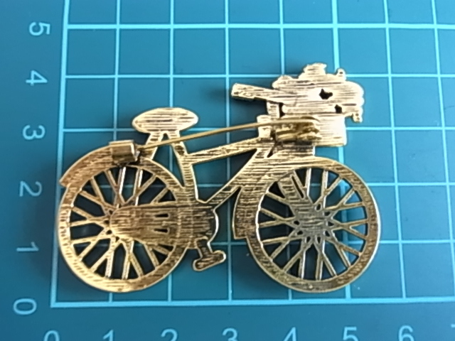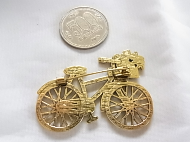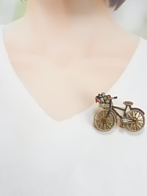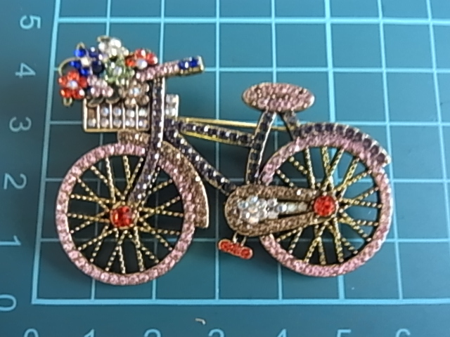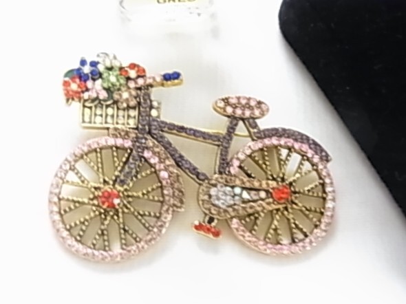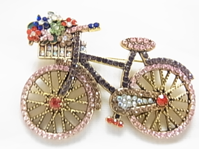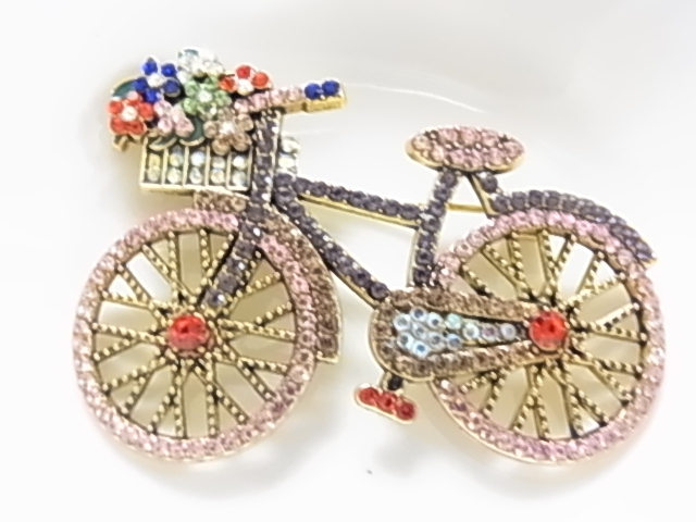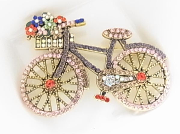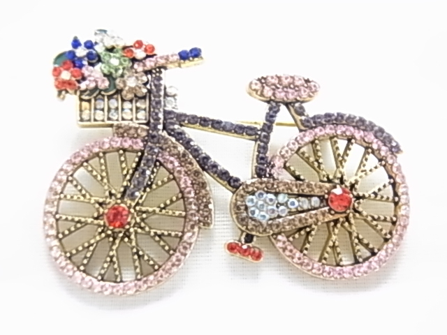 □未使用 きらきらと輝くピンクラインストーンが印象的なマルチカラーのの自転車モチーフ 籠にはお花 可愛らしいデザインのブローチ