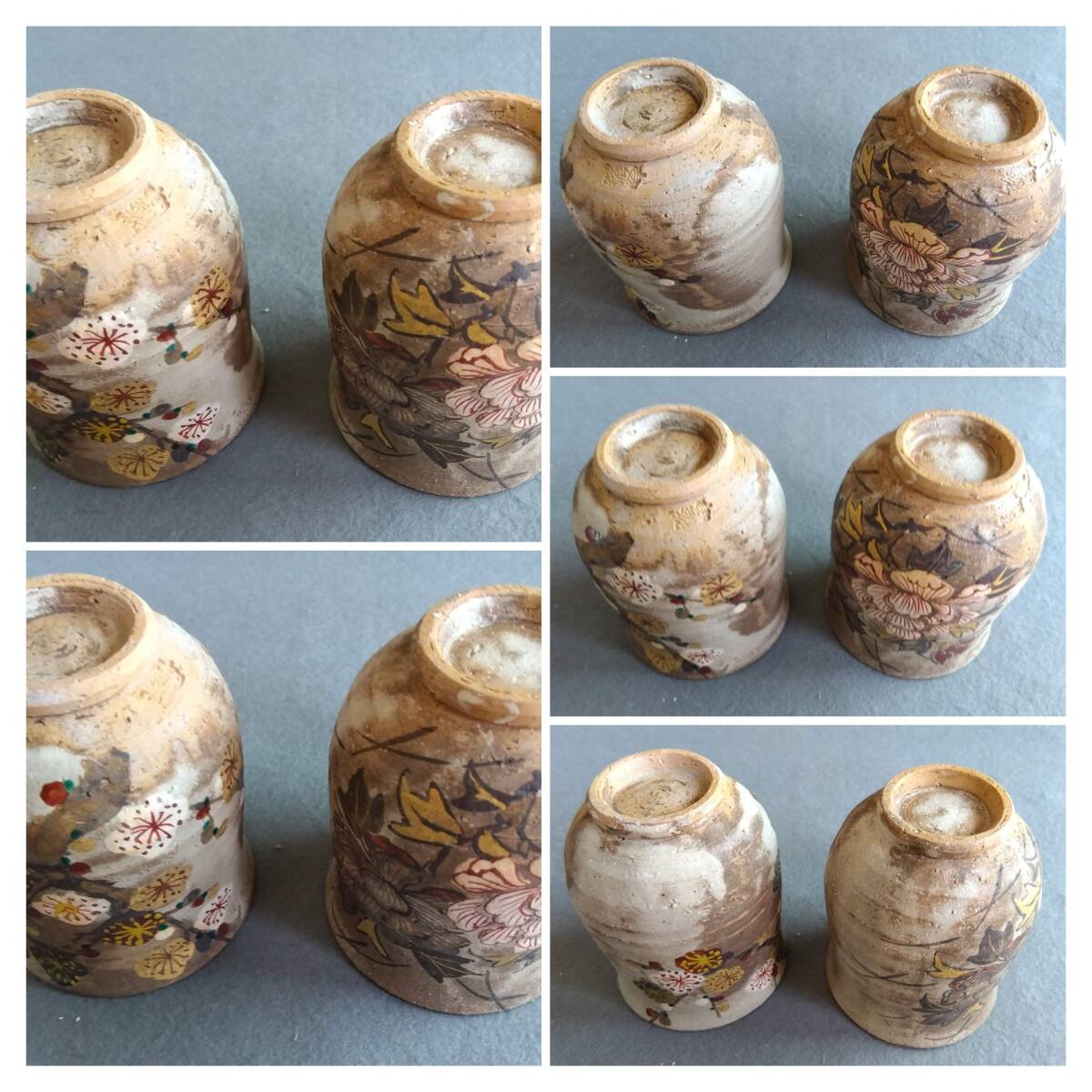 京薩摩 花柄紋様夫婦湯2個セット 作家名高台底刻印参照カラフルな薩摩焼花模様が施された京焼楽茶碗の温かみ手触り風趣が薩摩焼デザインとして見事に融合させた逸品です。30数年前京都器五条坂とある店で新人作家展が催させていて 気に入り仕入れした作品です。湯サイズ:玉縁口縁5mm 口径70/75 全高90/95 見込み深さ80/85mm 高台高X径X深さ10X45X8mm