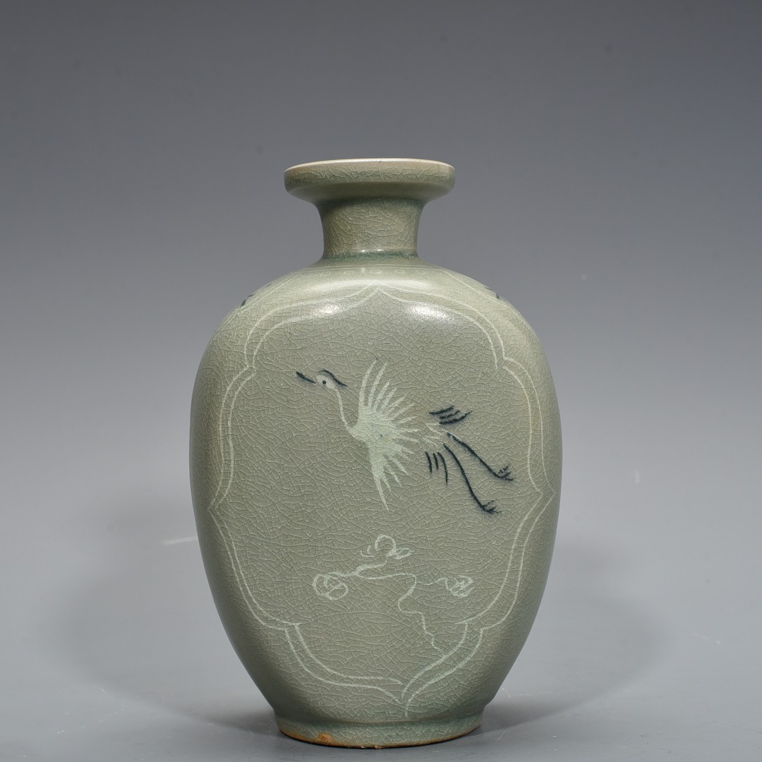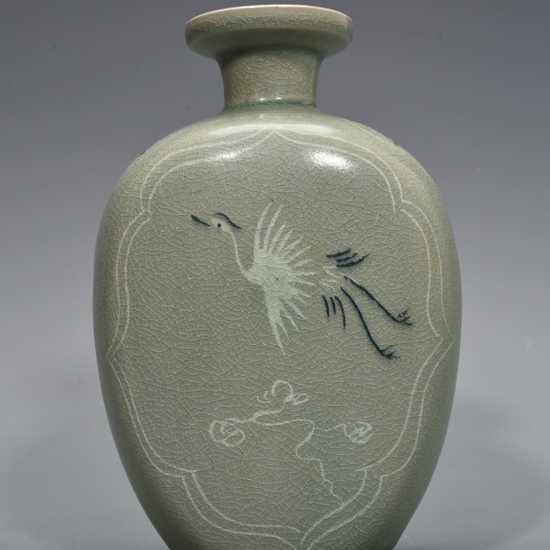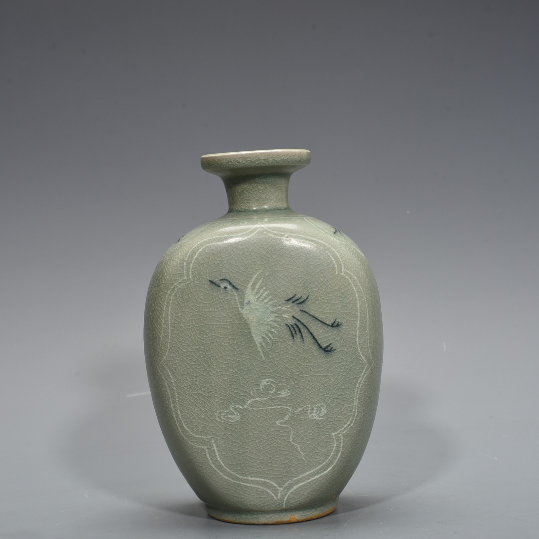 【李朝/高麗 特集出品】李朝粉青 雲鶴の紋様をちりばめた平たい瓶 朝鮮古陶磁器/李朝時代 朝鮮美術 622