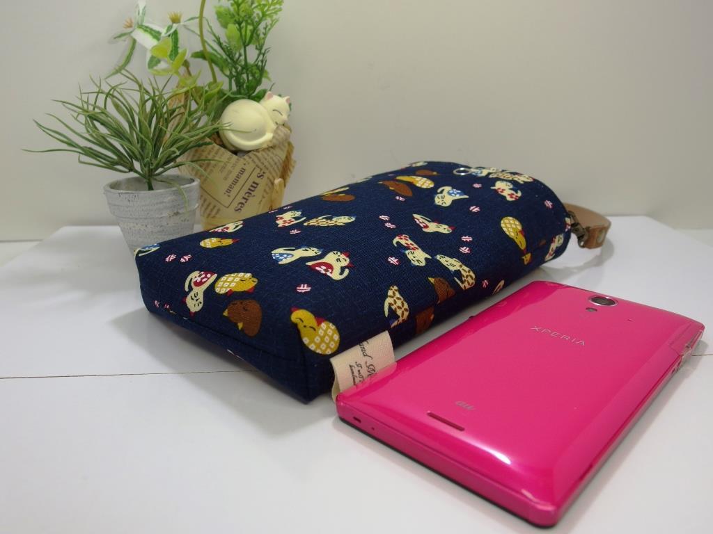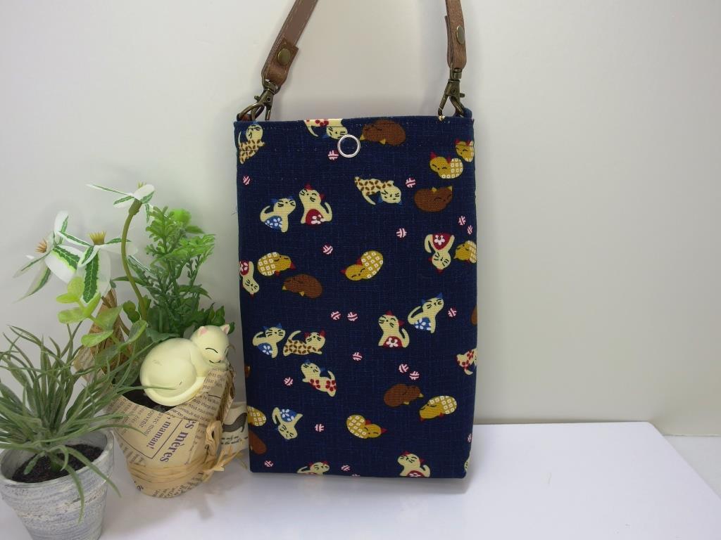 ハンドメイド 可愛い和柄猫のスマホ・携帯・デジカメ・色々使えるポーチ 濃紺④