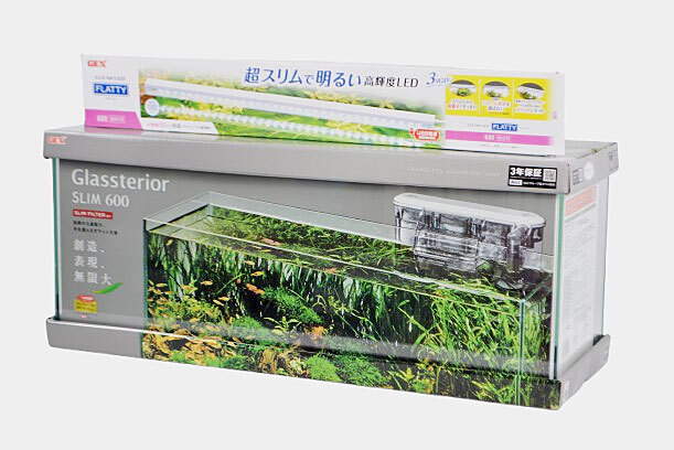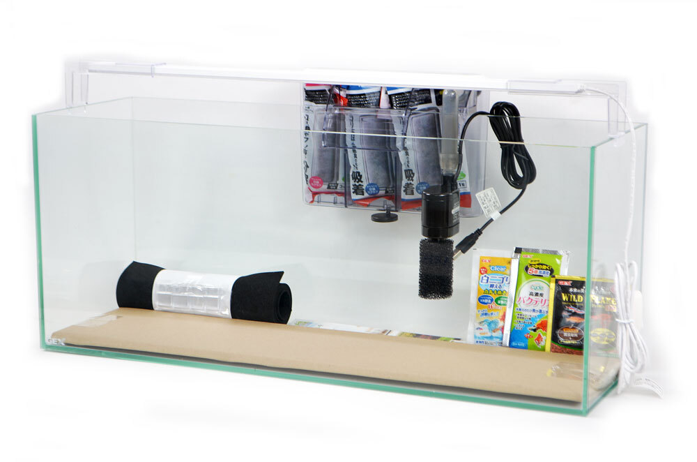 60cmスリムタイプ・フレームレスガラス水槽と外掛け式フィルター、LEDライトのセットです。